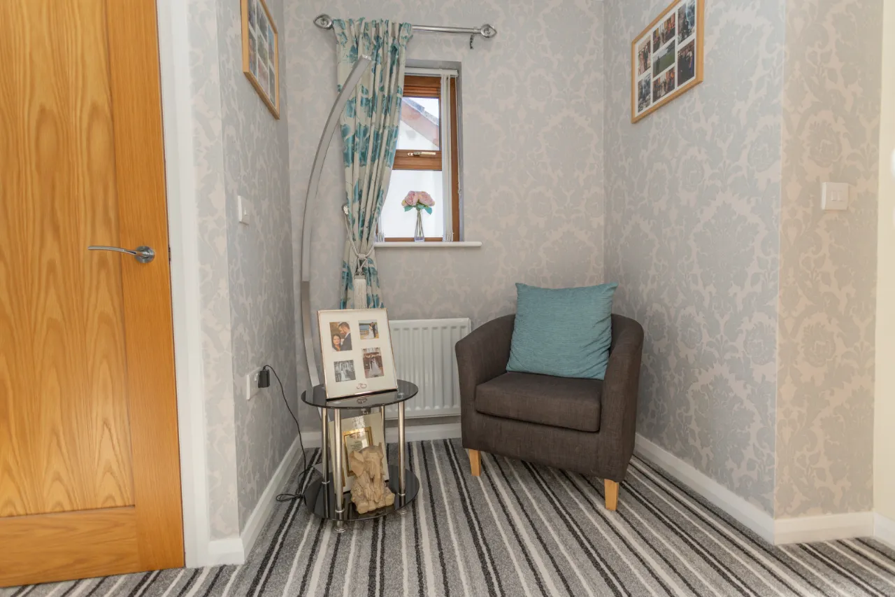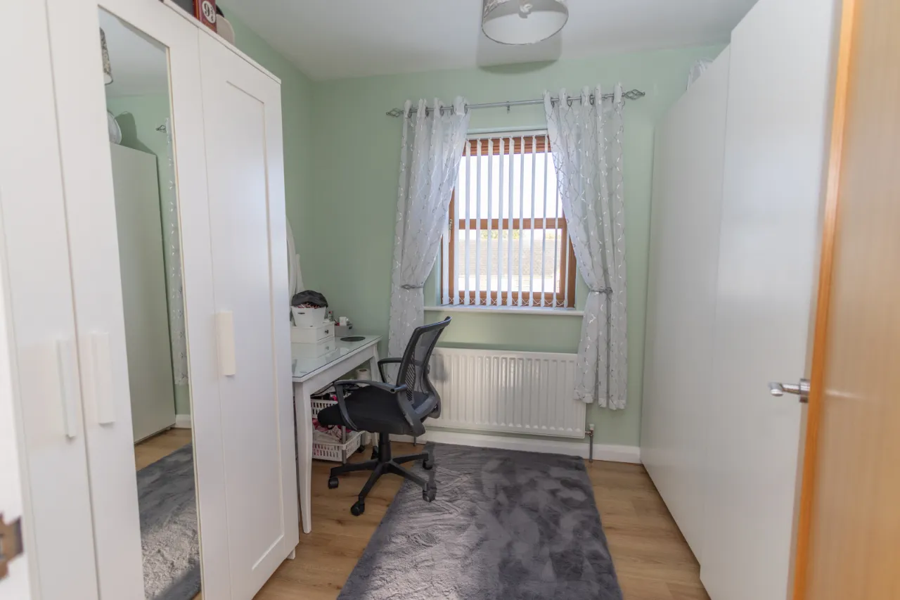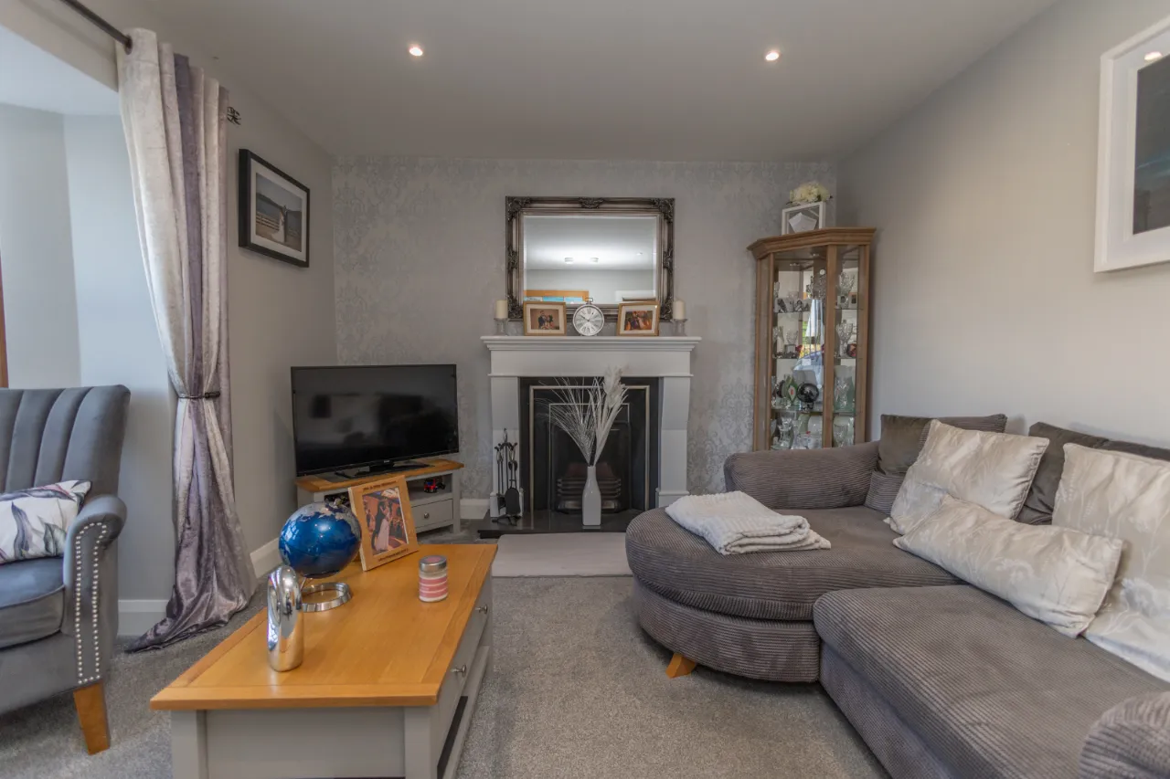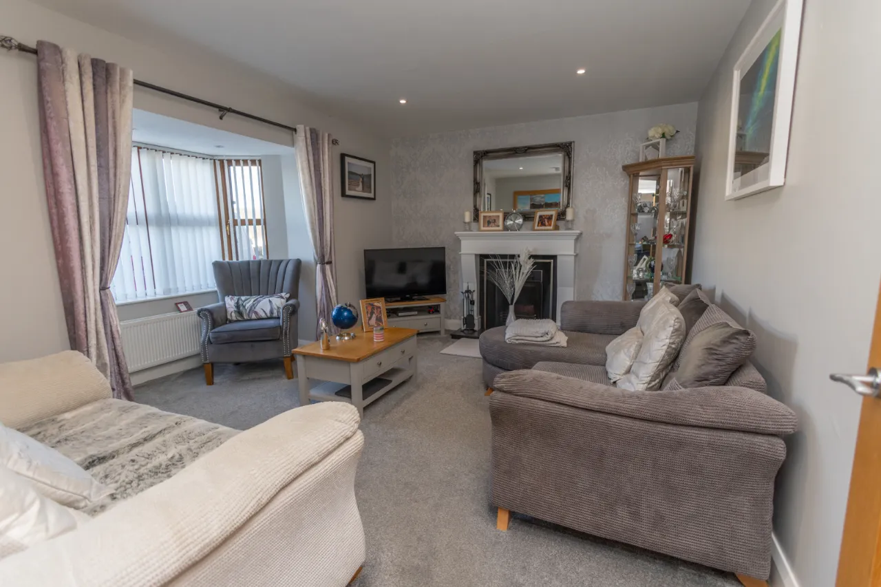 Front aspect with bay window, carpeted floor, open fire with cast-iron insert, polished granite hearth and marble surround. TV point and a double radiator.