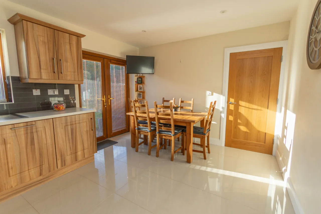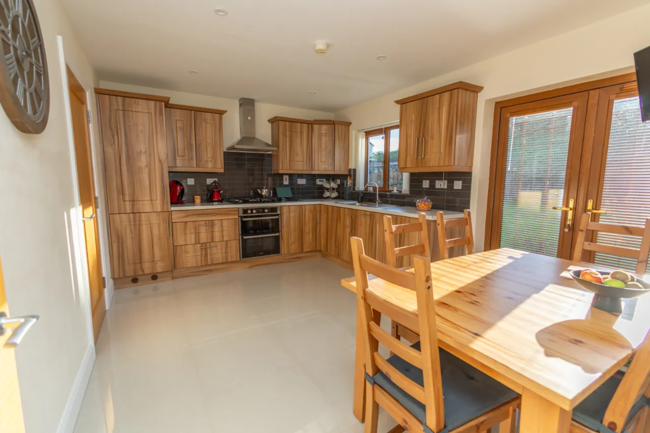 Tiled flooring; range of upper and lower units with tiled splashback. Integrated gas hob with electric oven beneath and extractor hood above. Single-bowl stainless-steel sink with drainer. Rear aspect overlooking the garden, with double patio doors opening to the rear.