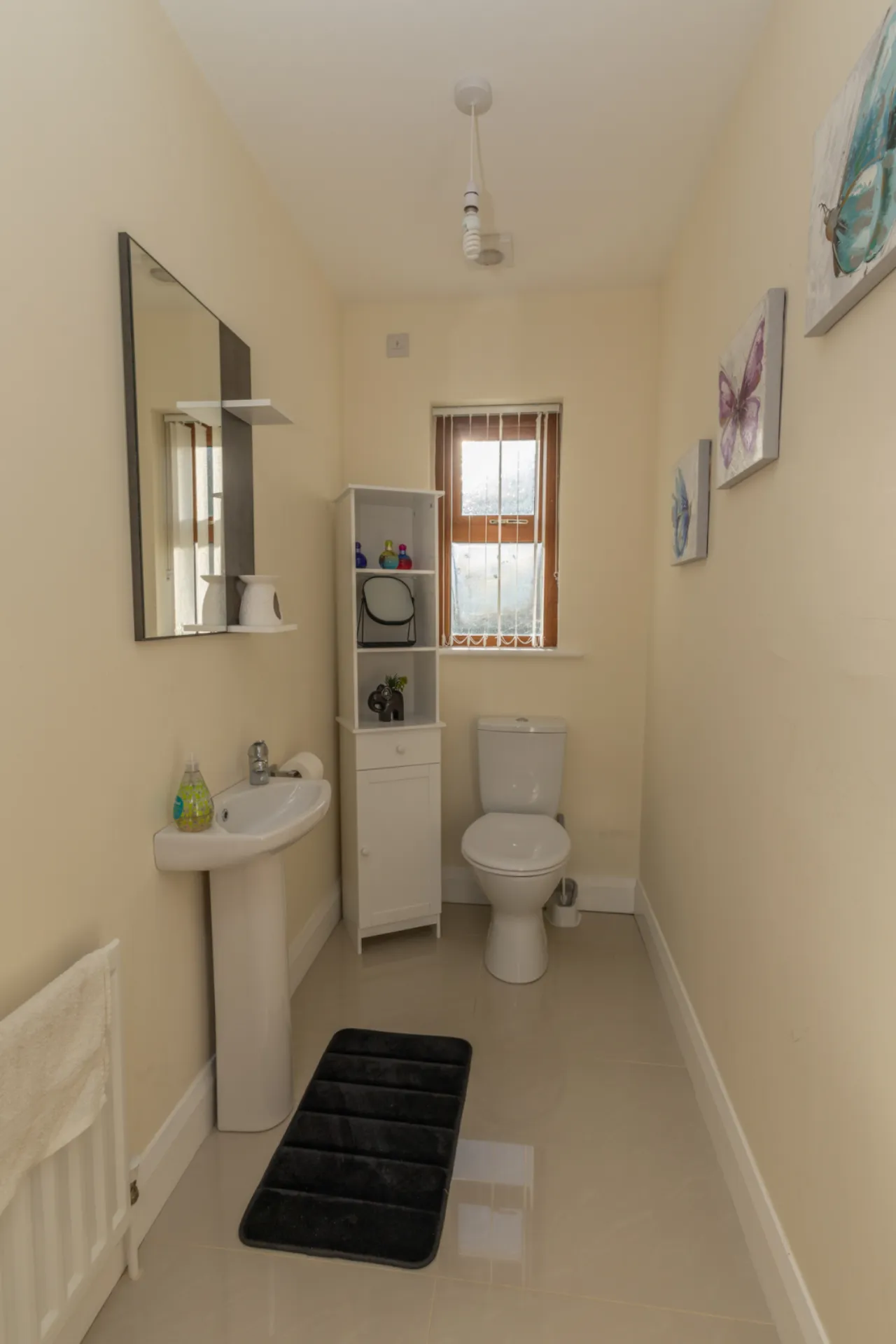 Tiled flooring; white suite comprising WC and wash hand basin; wall-mounted mirror above; single radiator.