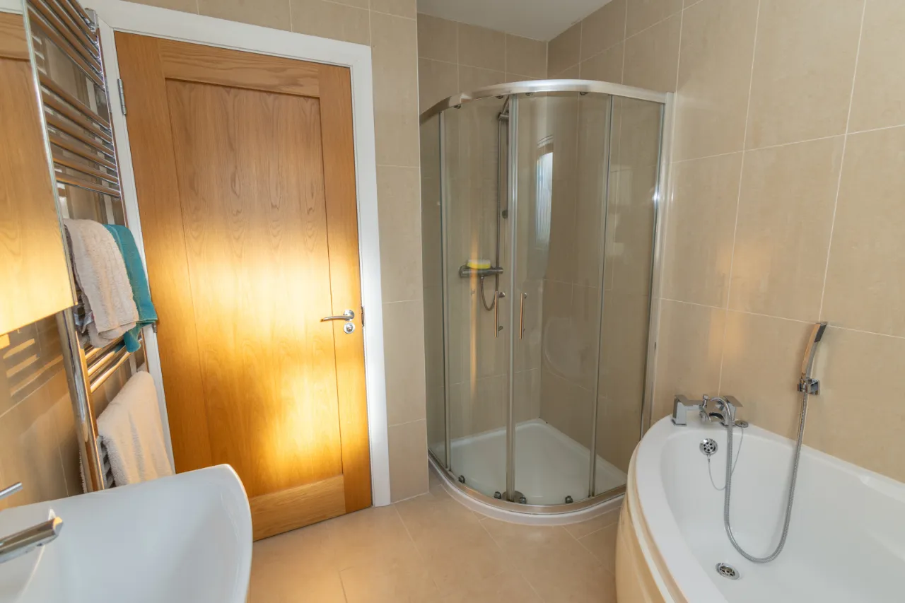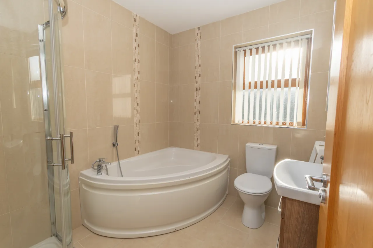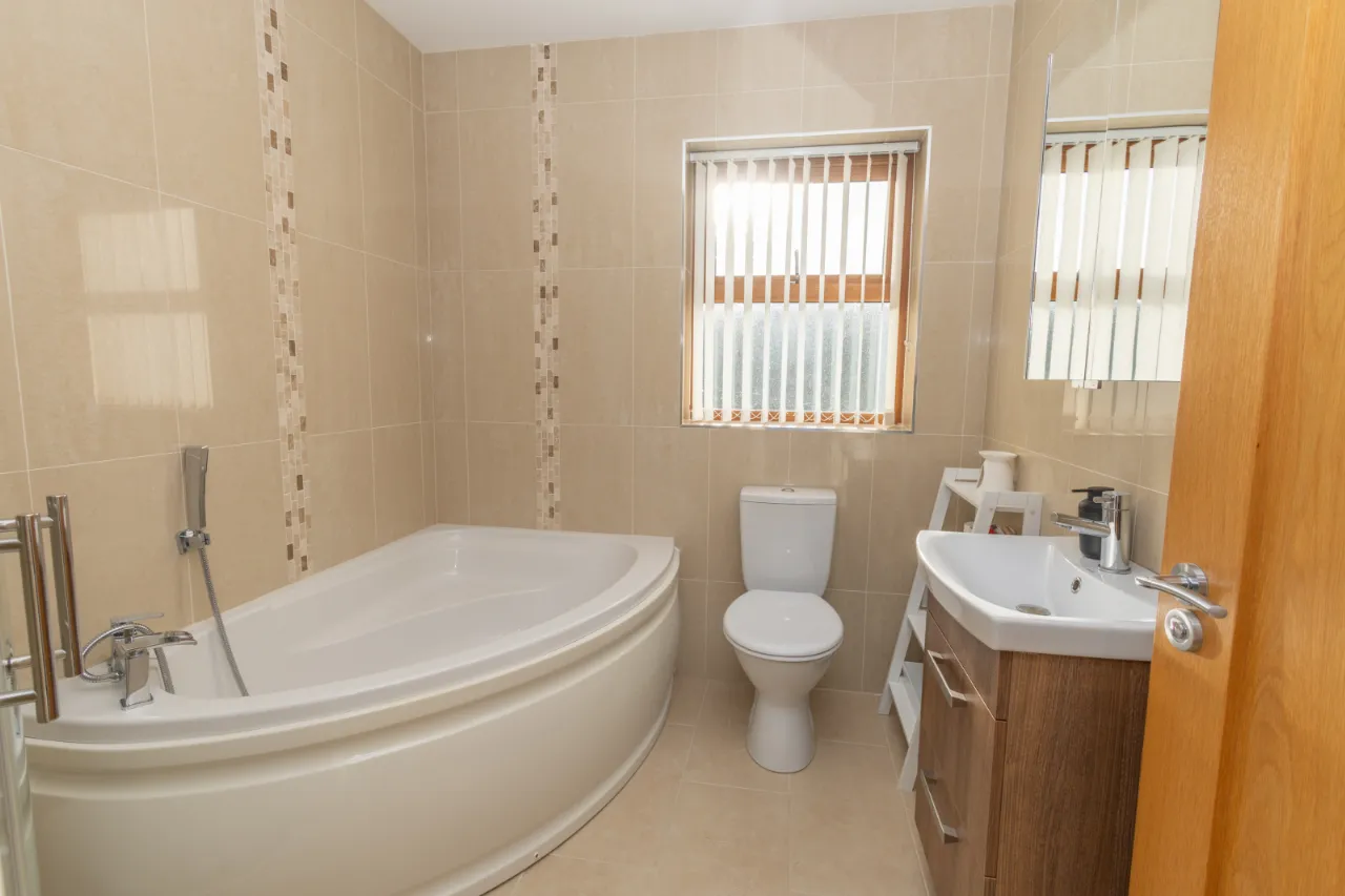 Fully tiled walls and floor; white suite with WC and wash hand basin set within a vanity unit, with wall-mounted vanity unit above; corner bath; mains-powered shower and heated towel rack.