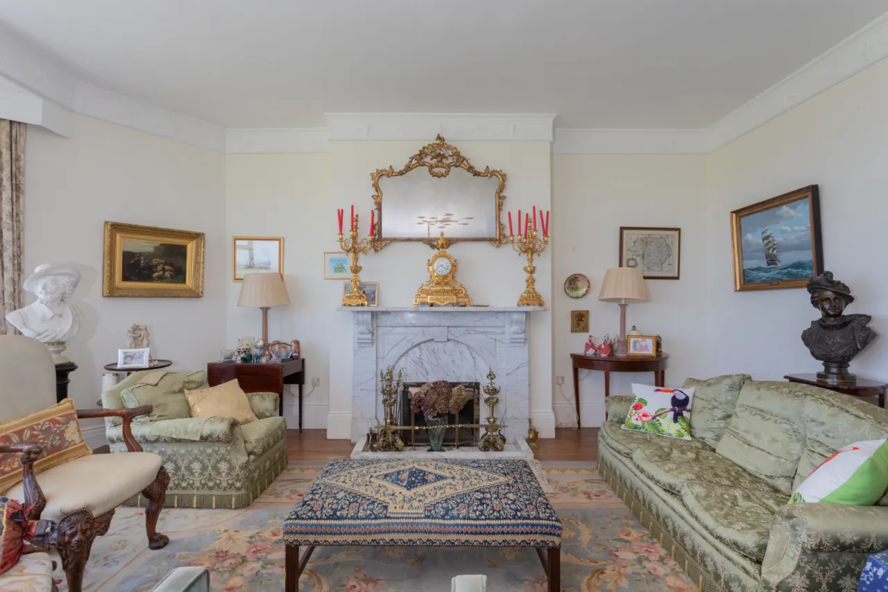 Attractive Italian marble fireplace, open fire, polished oak floor, large bay window providing panoramic views over rolling countryside, Whiterock, Newtownards, Scrabo Tower, Ards Peninsula, Craigantlet, Belfast Hills and West Coast of Scotland on a clear day.