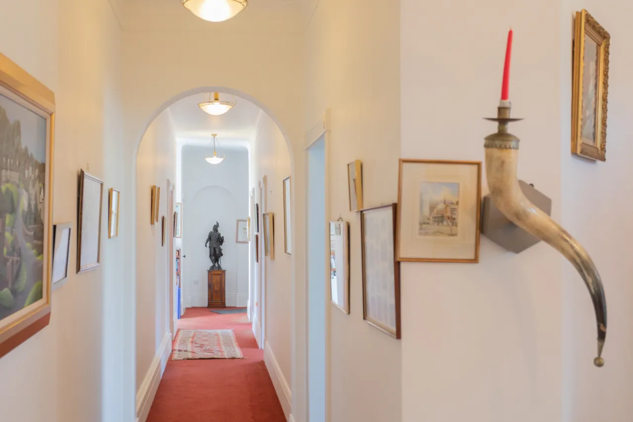 Polished oak floor, oval ceiling, cornice ceiling, cornice rose, leading to central hall, polish oak floor, corniced ceiling, double doors to drawing room