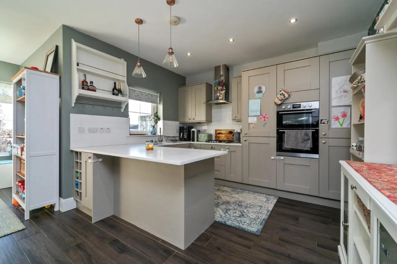 Range of high and low level units, quartz worktops, double electric oven, gas hob, stainless steel extractor fan, inset stainless steel sink unit, integrated fridge freezer, integrated dishwasher, integrated washer dryer, part tiled walls, pantry, uPVC door to patio