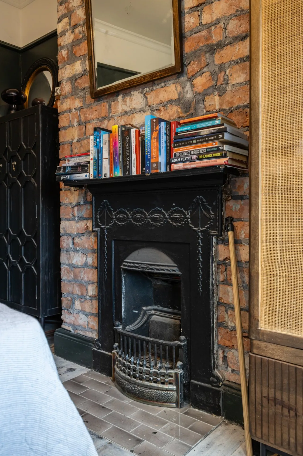 Solid wood floor, antique fireplace