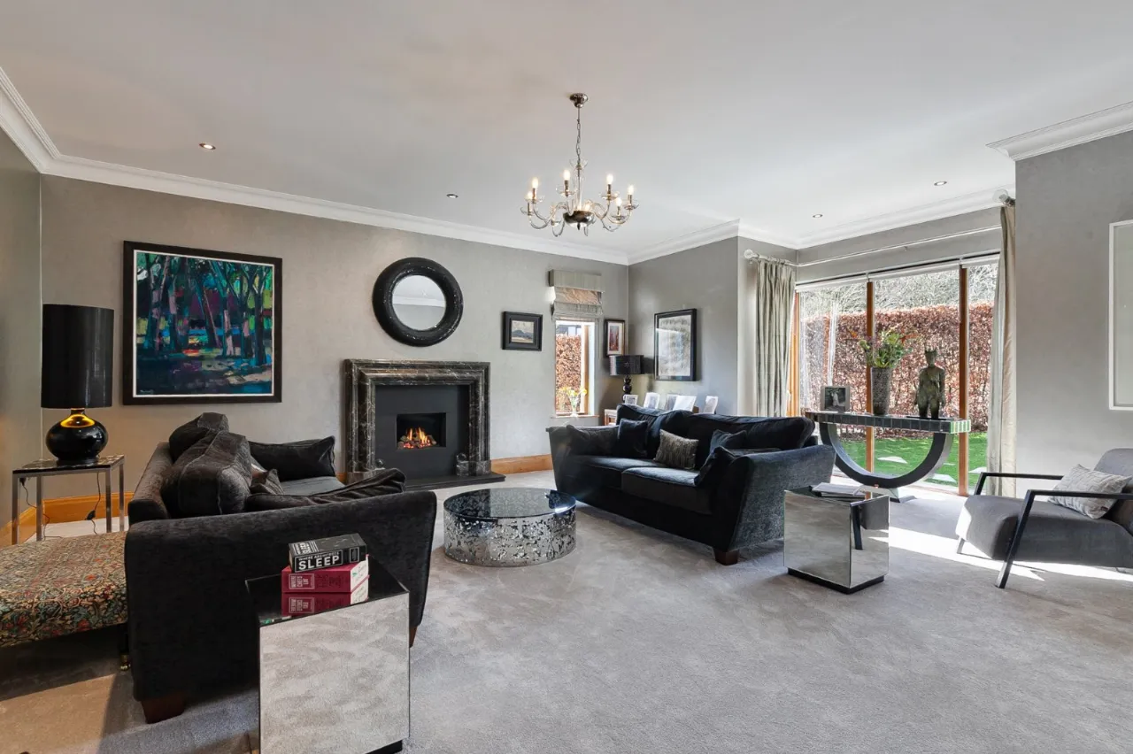 Attractive marble fireplace with gas fire, cornice ceiling, spotlights