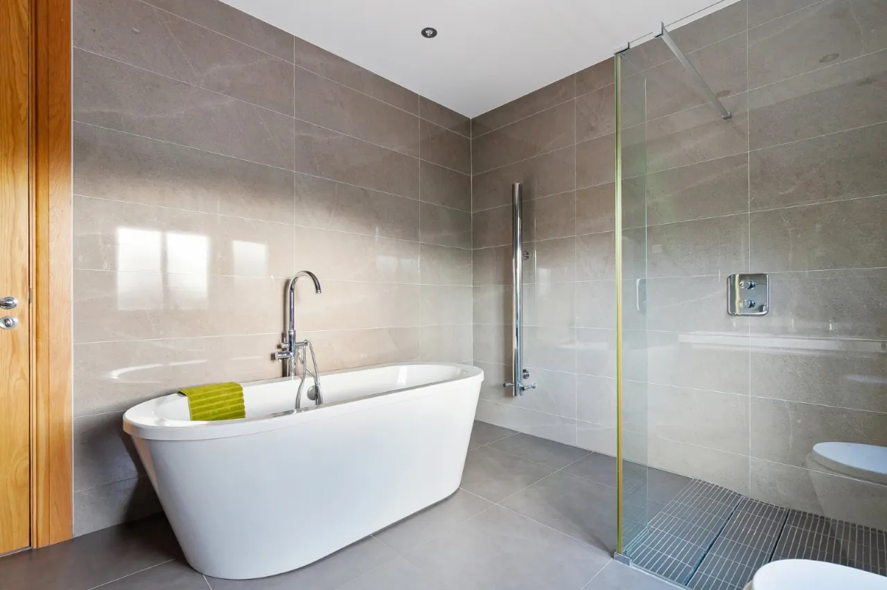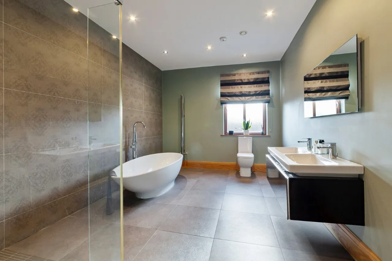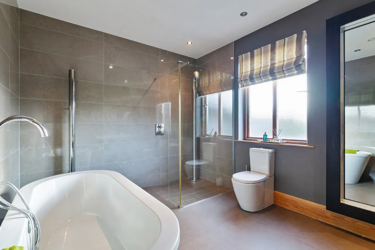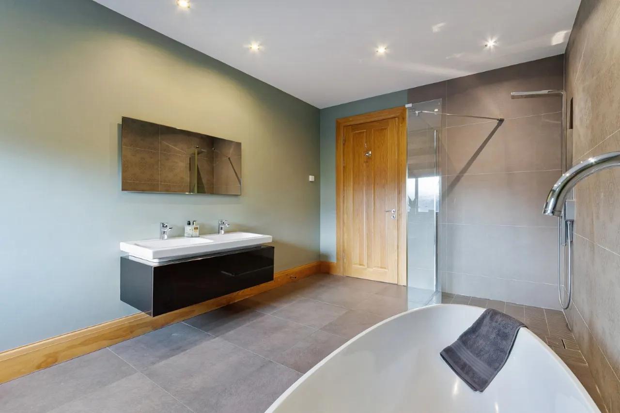 Free standing bath with mixer taps and telephone hand shower, walk in shower enclosure, overhead shower, WC, twin wash hand basin in vanity unit