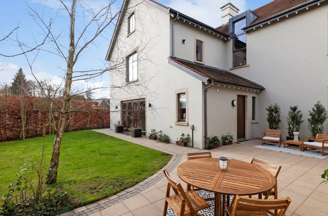 Electric gates leading to generous driveway parking, gardens front and rear lawns and patio, outside light and tap