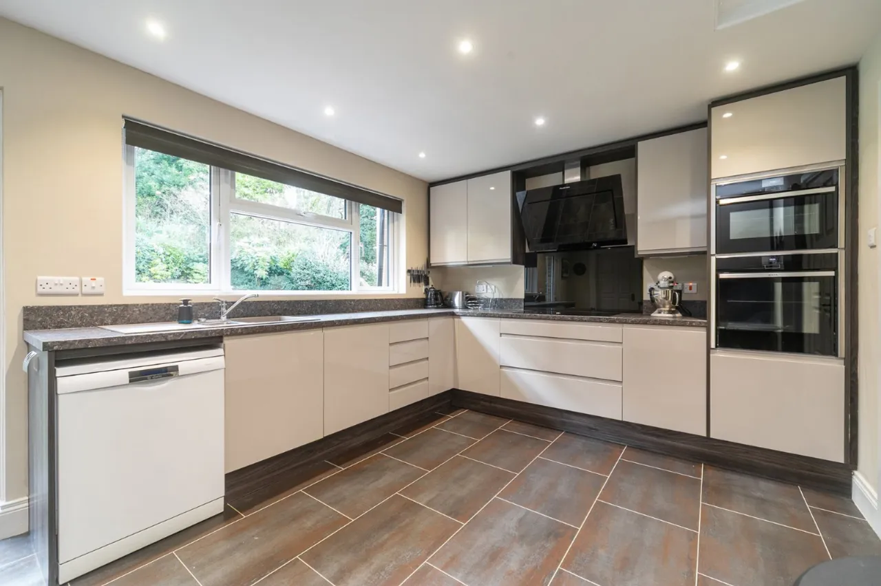 Spotlighting, ceramic tiled floor, range of high and low level units, 'Blanco' 1.5 bowl drainer sink unit, integrated fridge, pull out bin, 'NEFF' ceramic hob, two separate 'NEFF' electric ovens, extractor fan and uPVC double glazed door leading outside