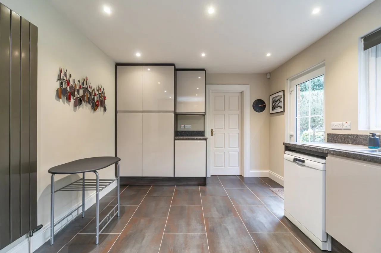 Power and light, electric roller shutter door, plumbed for washing machine and space for tumble dryer, Worchester gas boiler