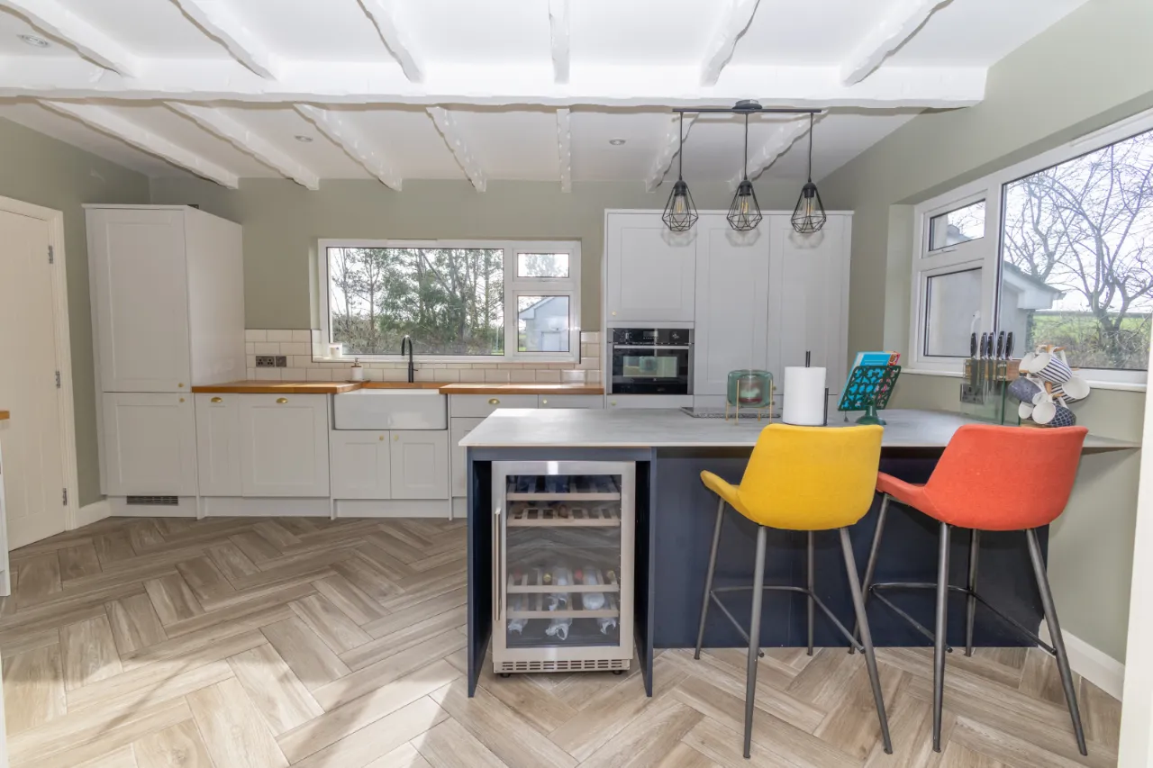 Oil fired heating AGA, LED recessed lighting, exposed wood beam ceiling, Quooker tap, Belfast sink, integrated fridge freezer.