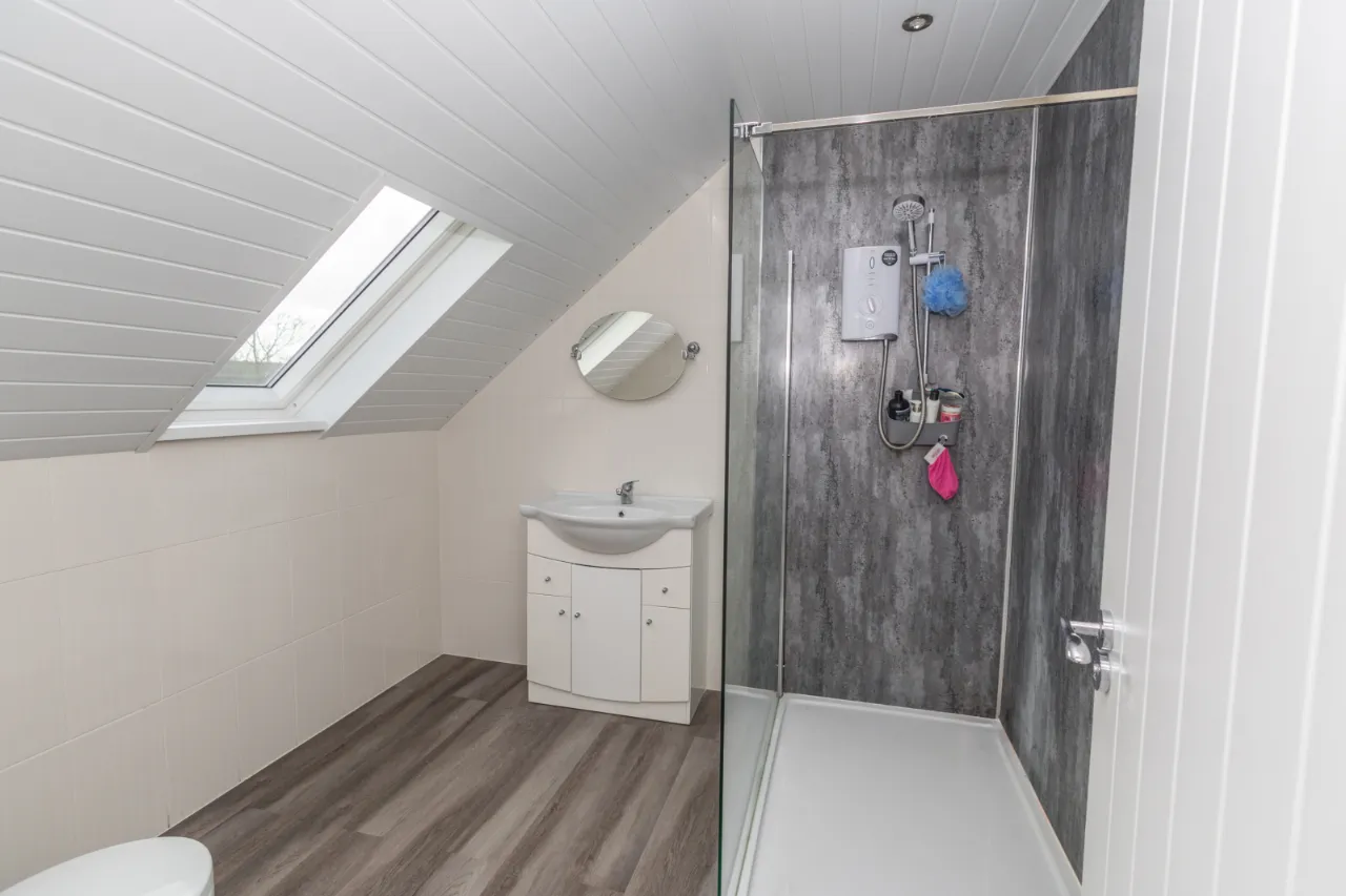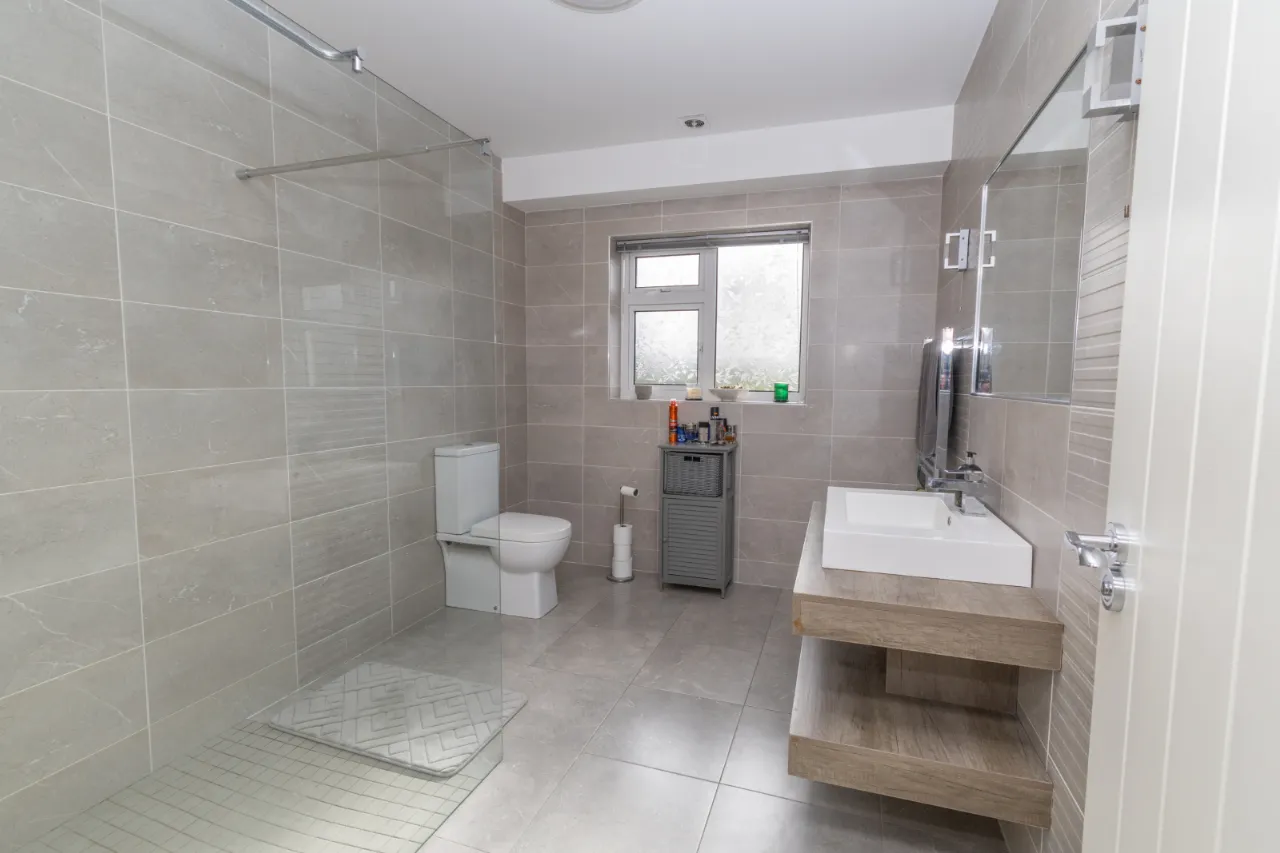 Towel radiator, walk-in shower, floating sink, high/low level flush toilet.