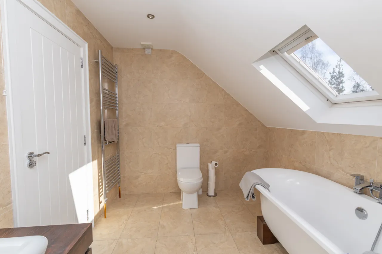 Tiled flooring, bath with mixer tap and hose, vanity unit with wood effect finish, LED mirror, motion sensor light.