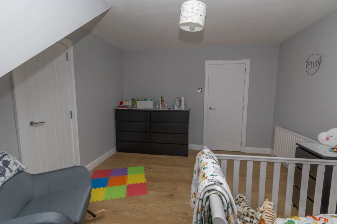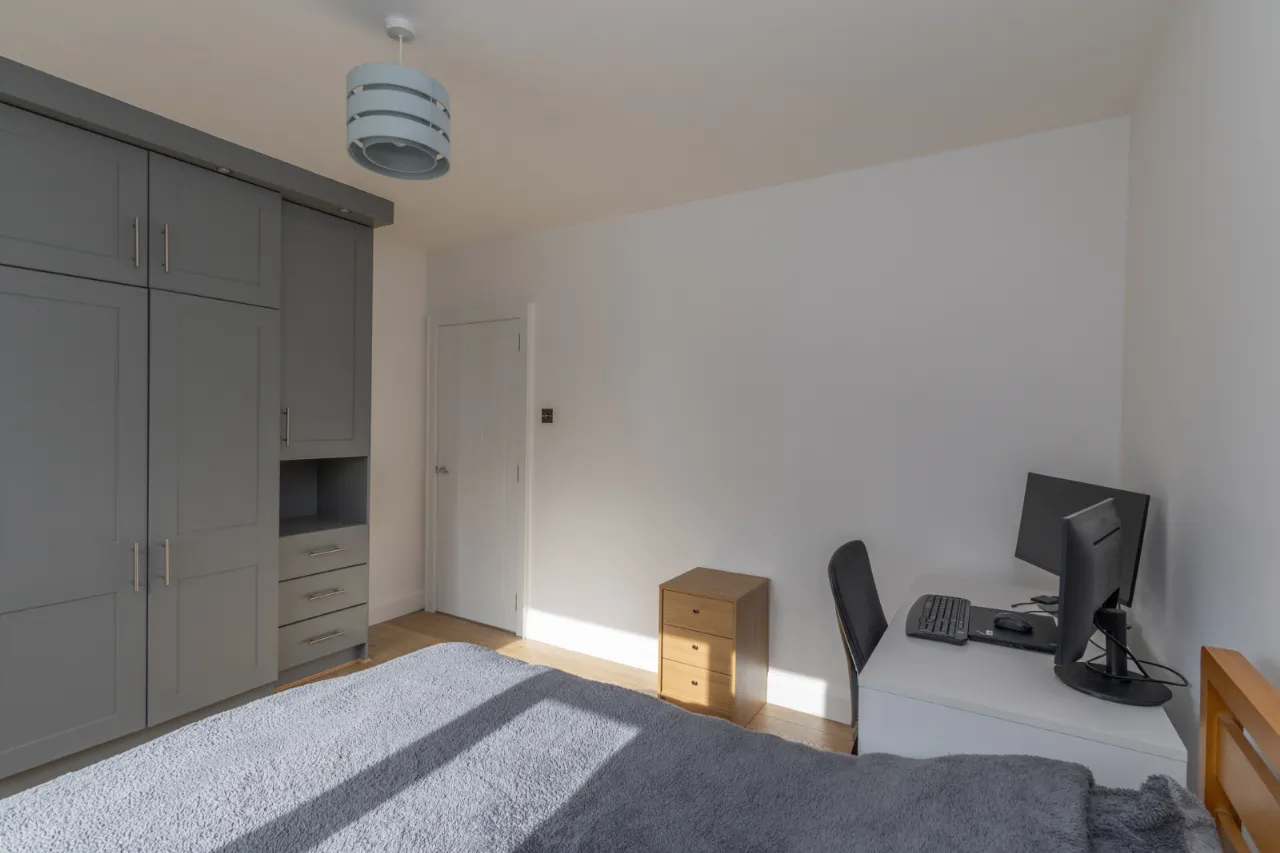 Oak laminate flooring, built-in wardrobes.