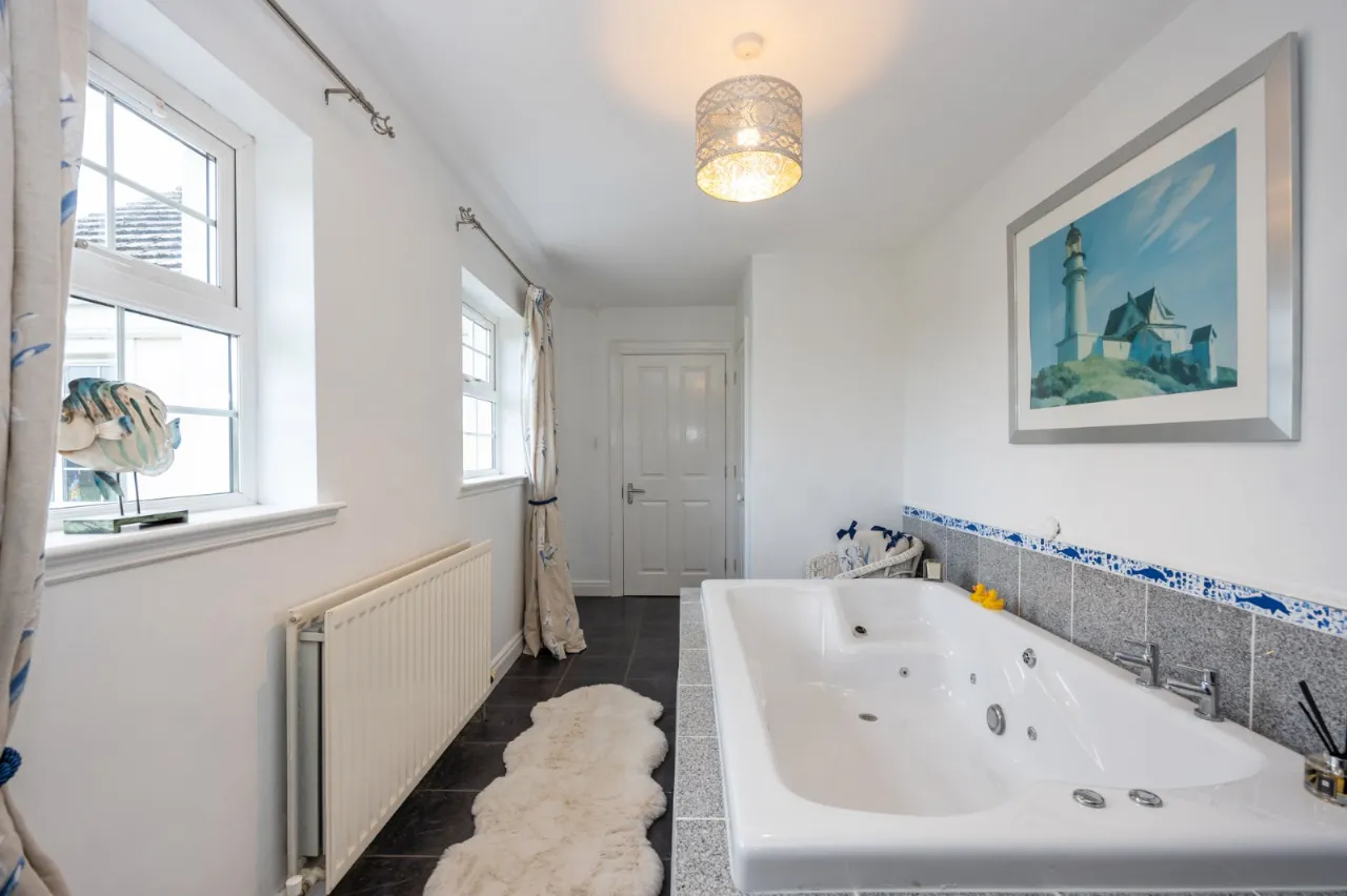 Modern white suite comprising: Large panelled multi jet bath, vanity floor stand with wash hand basin with mixer taps, push button WC, wall tiling, ceramic tiled floor, extractor fan, concealed hotpress, Megaflo high efficiency tank.