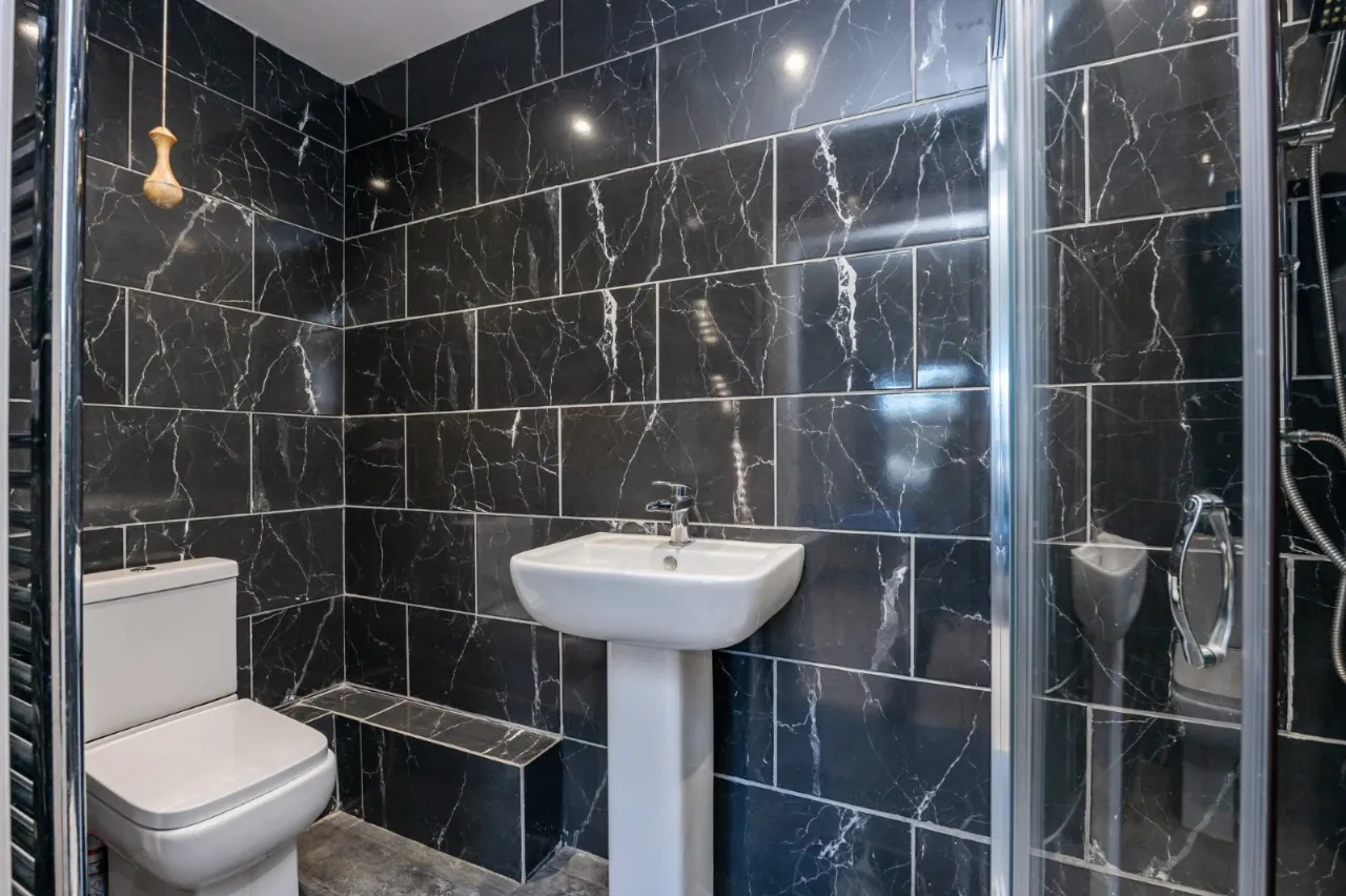 White suite comprising: Separate fully tiled shower cubicle with Mira thermostatically controlled shower unit, pedestal wash hand basin, low flush WC, wall tiling, ceramic tiled floor, extractor fan, towel radiator.