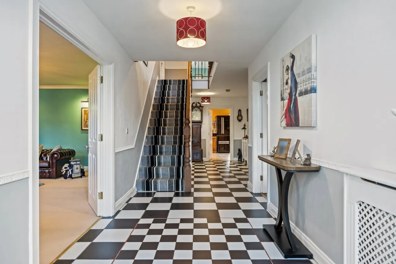 Ceramic tiled floor, under stairs storage, double doors to Living Room.