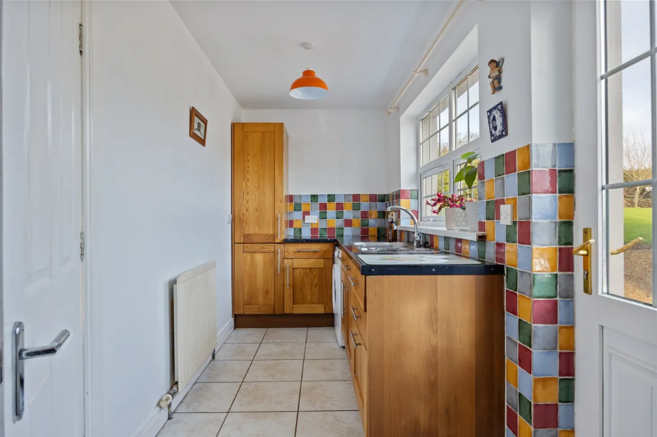 1.5 tub single drainer stainless steel sink unit with mixer taps, range of high and low level oak shaker style units, Formica roll edge work surfaces, plumbed for washing machine, wall tiling, ceramic tiled floor, uPVC double glazed door to rear.