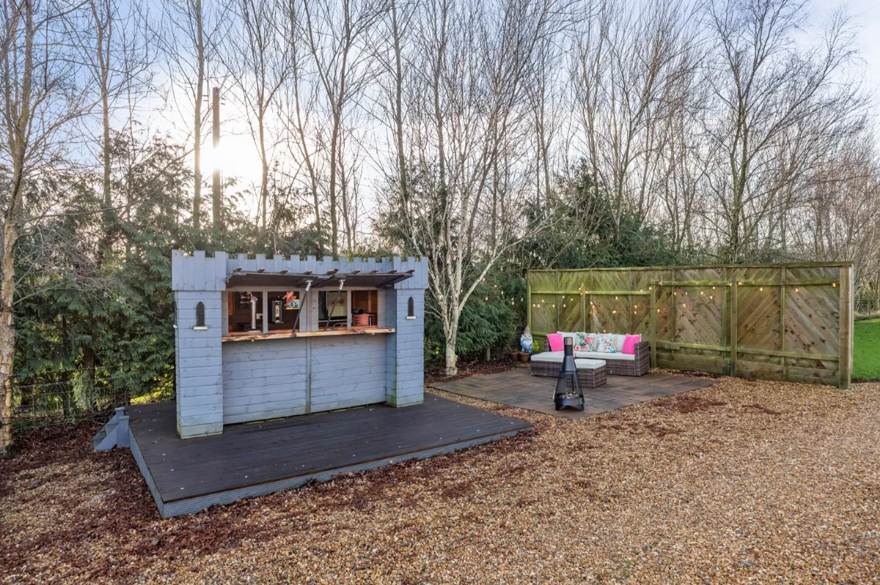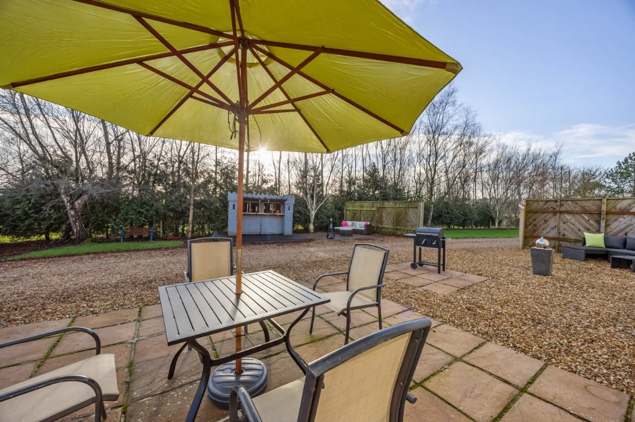 To front, side and rear in landscaped gardens, manicured lawns, paved patios, large gravel patio, themed garden bar with timber deck, selection of mature trees, hedging, fenced storage area.