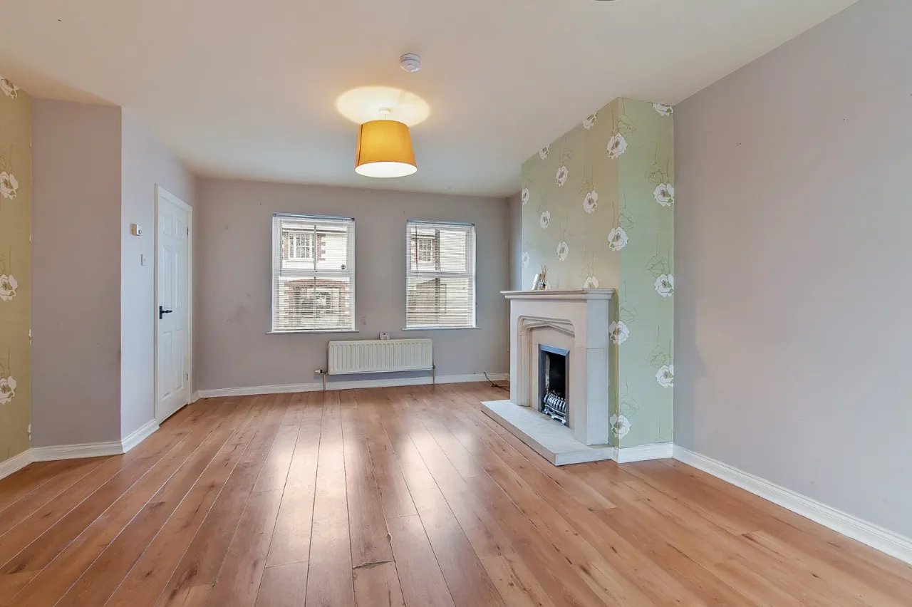 Attractive stone fireplace with gas fire, laminate wood floor, double uPVC doors to paved enclosed garden