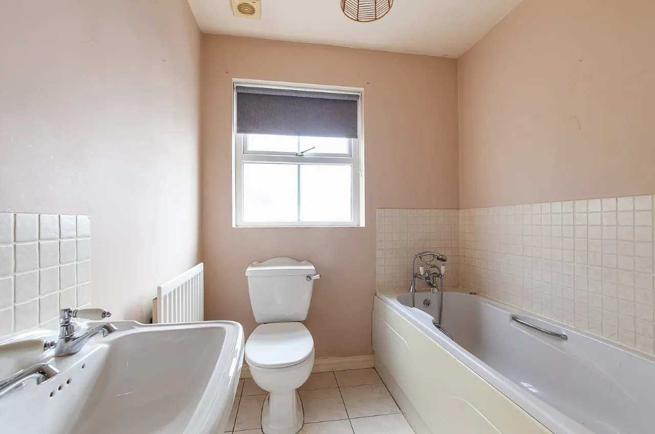 Ceramic tiled floor, low flush WC, pedestal wash hand basin