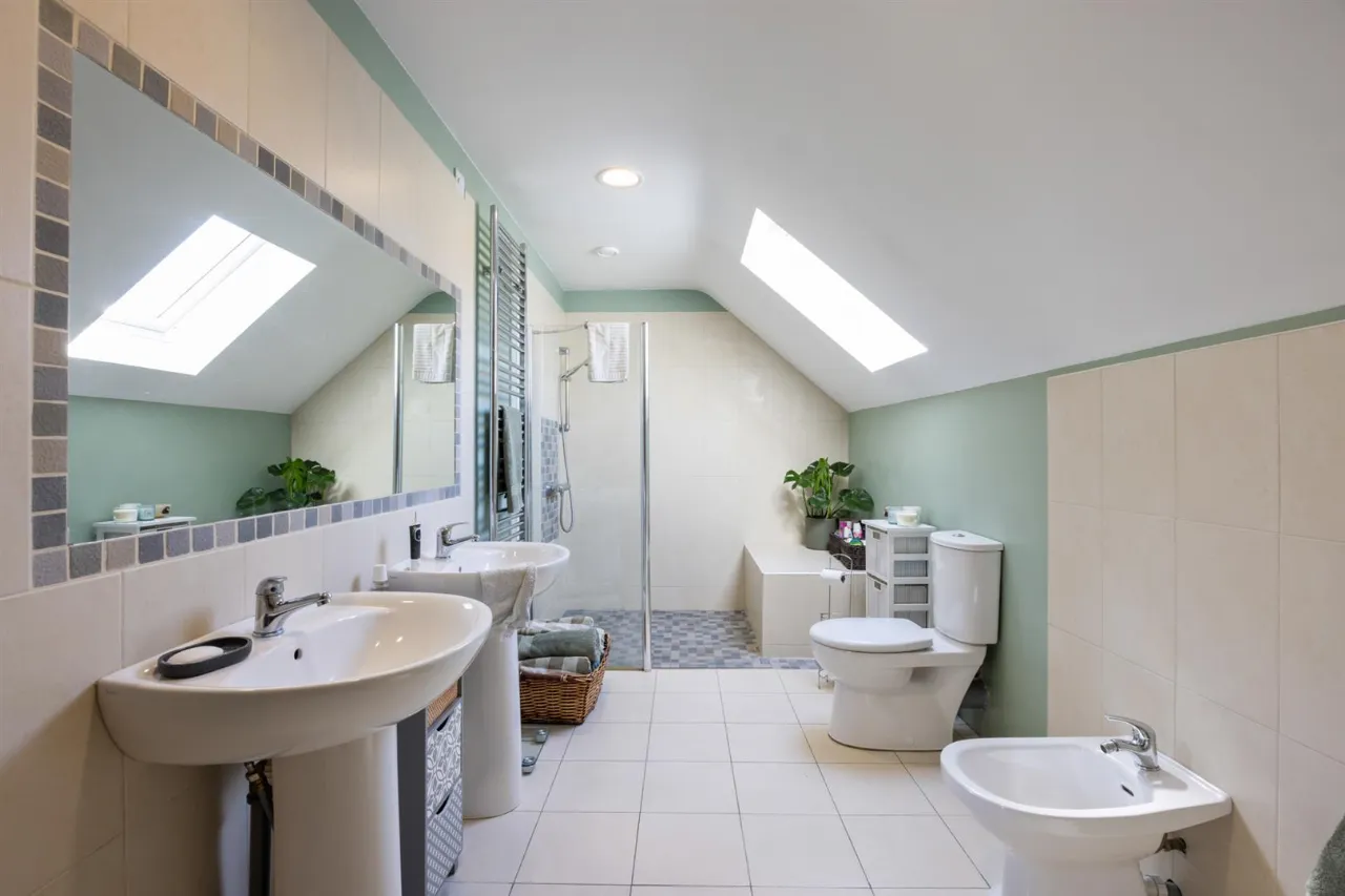 Ensuite - Modern ensuite shower room comprising a white suite with panelled bath and mixer taps, walk-in shower enclosure, low flush WC, twin wash hand basins, and bidet.