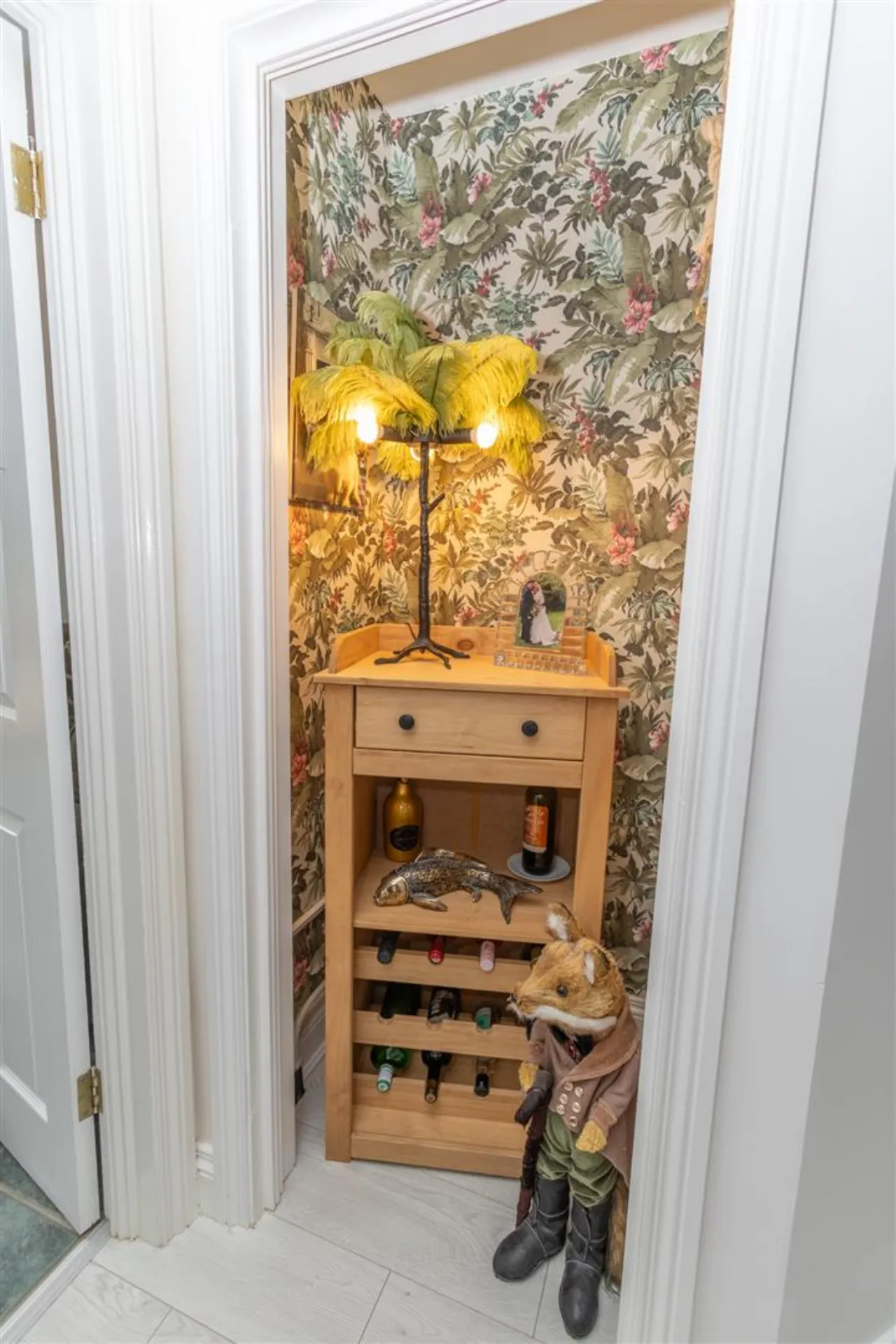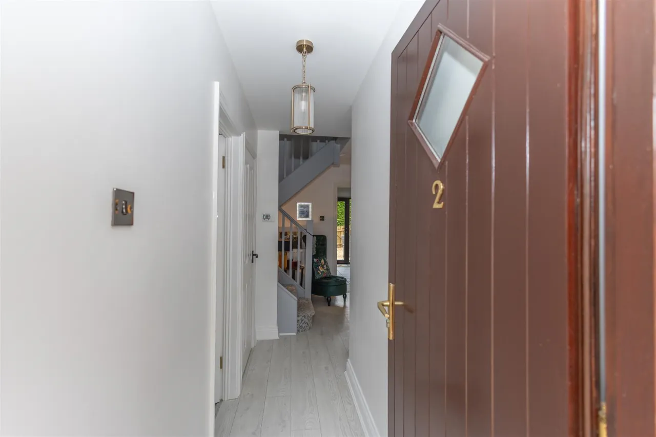 Solid wood mahogany front door leading to spacious entrance hall. Laminate wooden flooring.