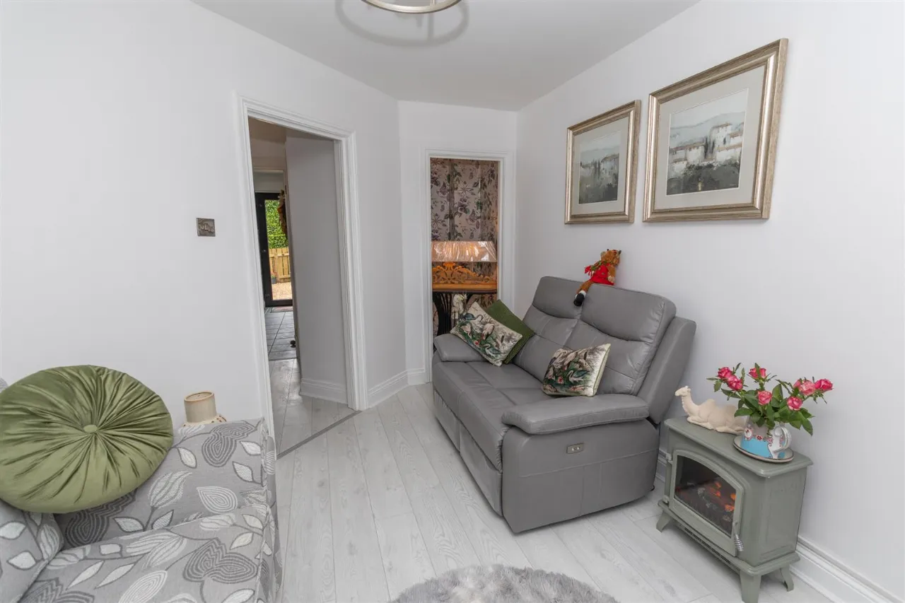 To the front, a charming rockery with established planting enhances kerb appeal, while a spacious driveway provides off-street parking for two vehicles.