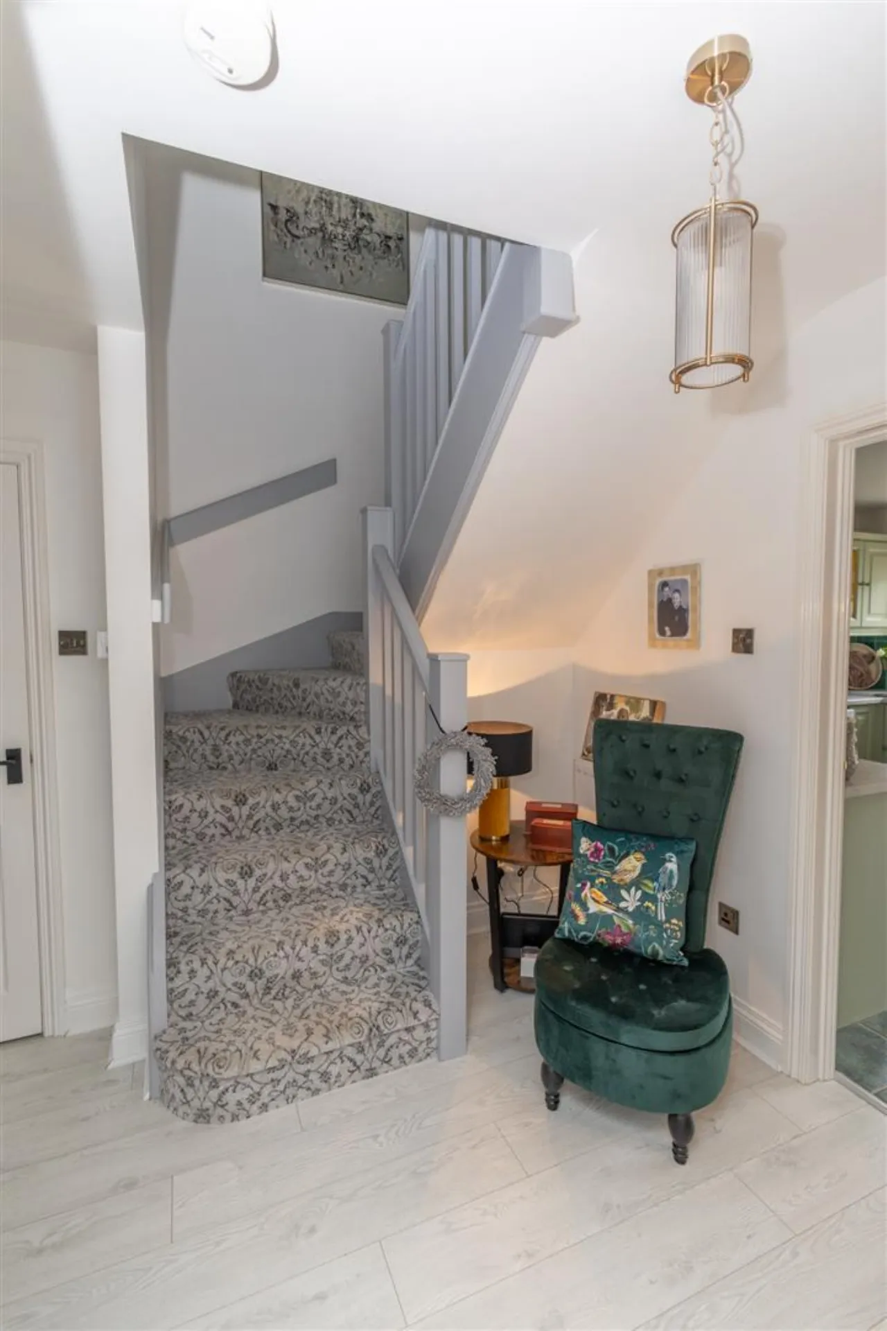 Carpeted Flooring on stairs. Grey painted balustrade.