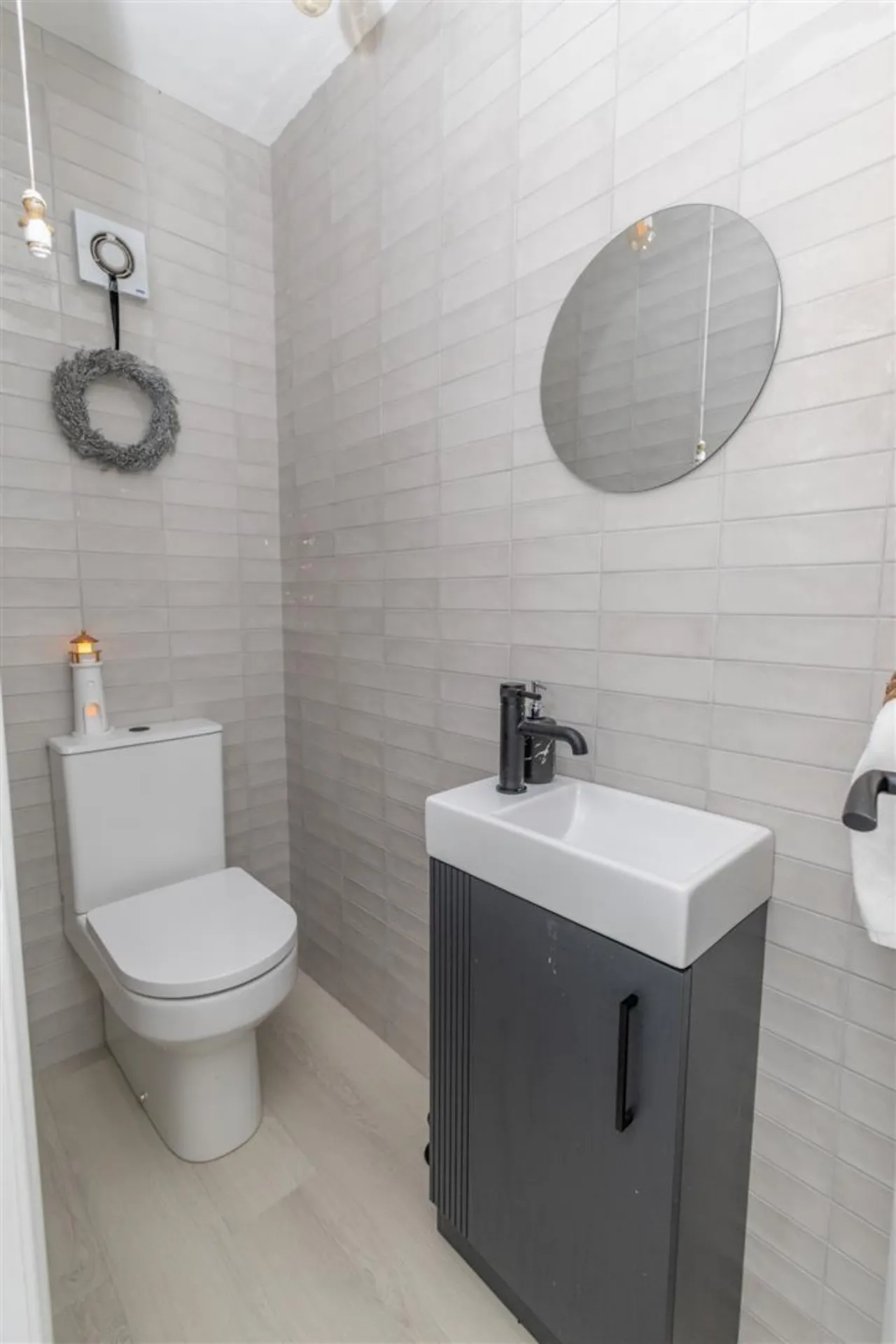 Fully tiled walls and PVC floor. Low flush W.C. Contemporary vanity unit with wash hand basin and feature black mixer tap. Single radiator.