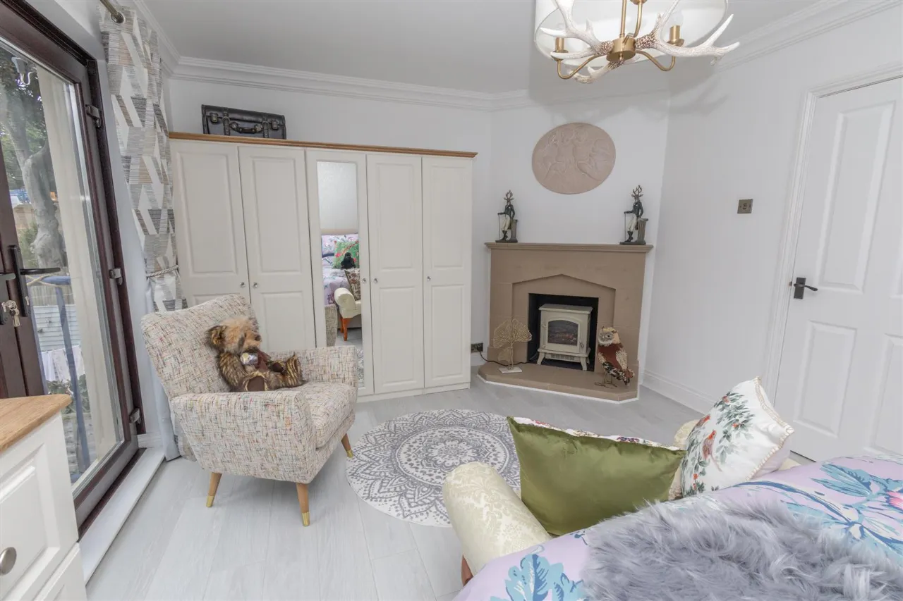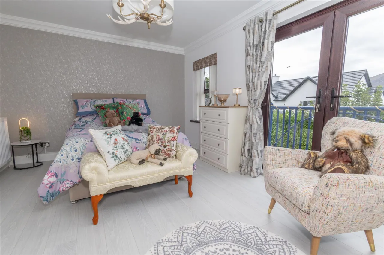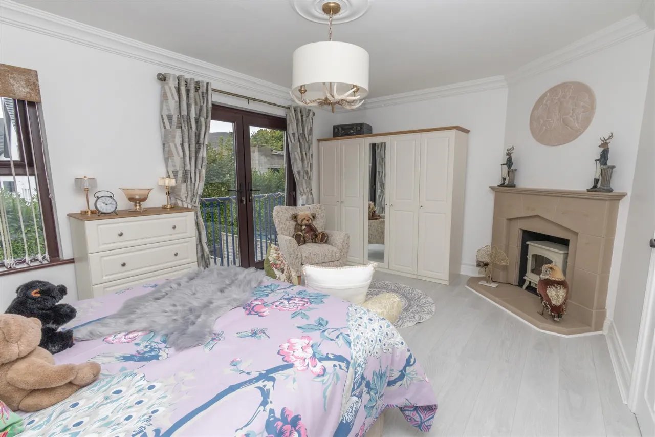 Beautiful master bedroom featuring juliette balcony with patio doors opening inwards overlooking the Mourne Mountains. Marble sand fireplace with electric feature stove. Laminate wooden flooring. Double radiator.