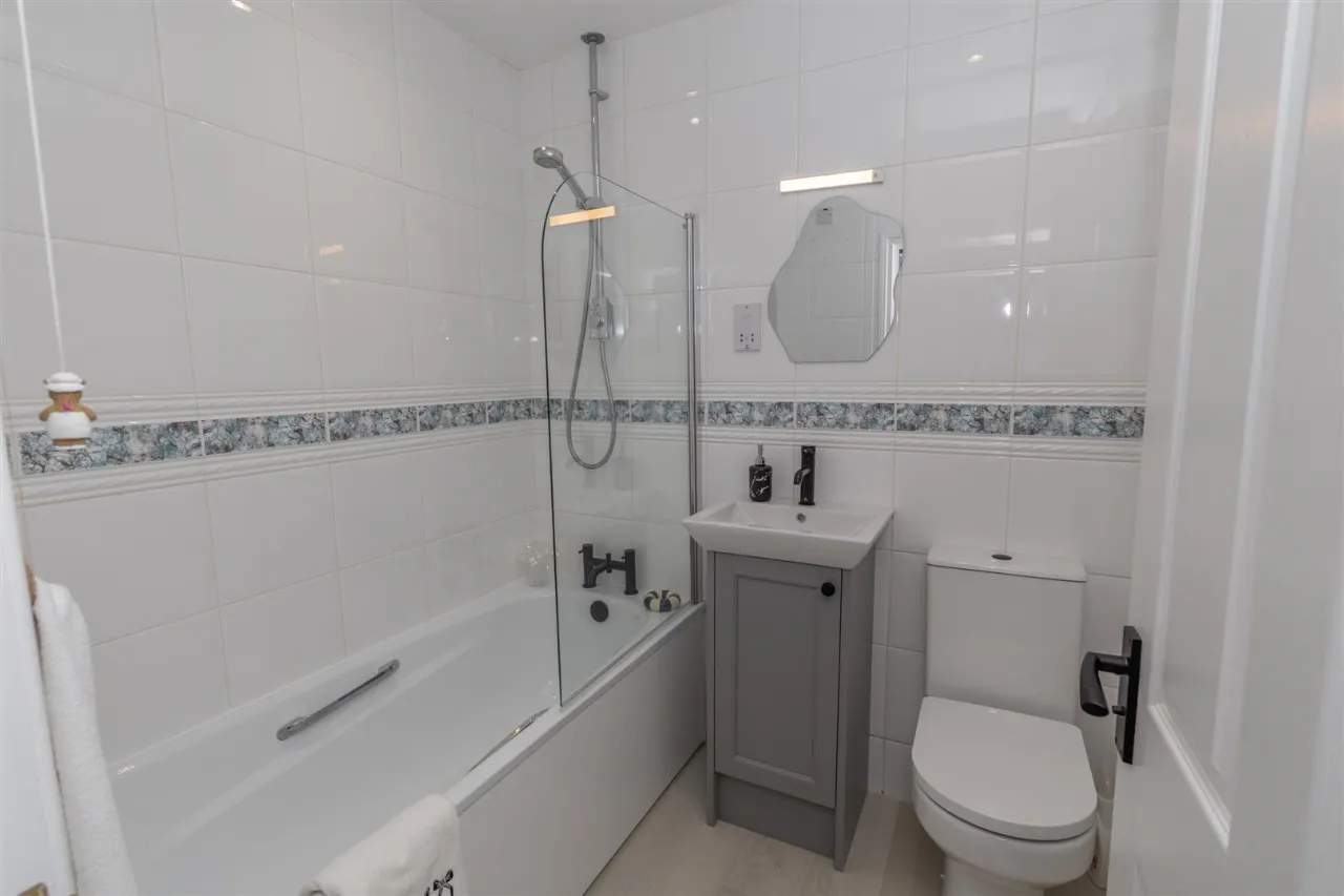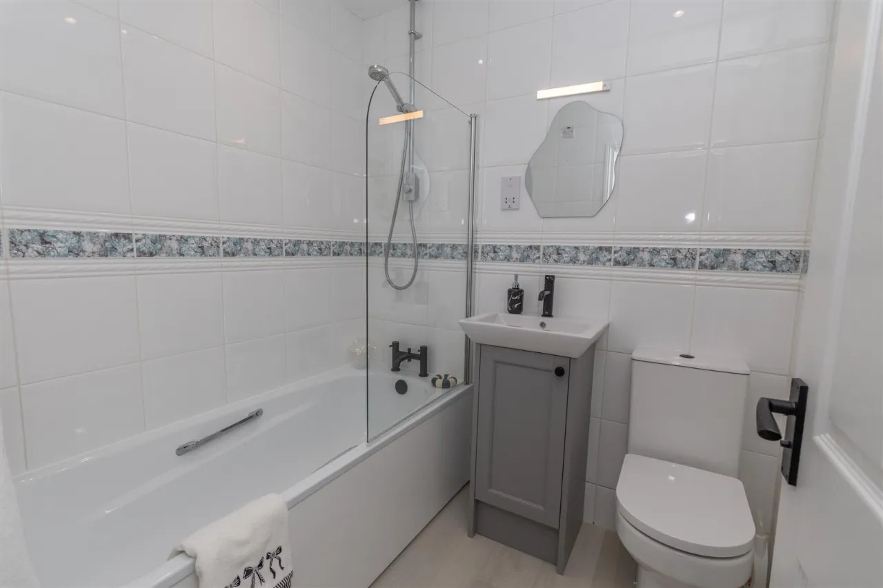 Contemporary family bathroom, featuring white bathroom suite comprising low flush W.C. vanity unit with white wash hand basin and black mixer tap with mains shower over bath with glass shower screen. Fully tiled walls and PVC flooring.