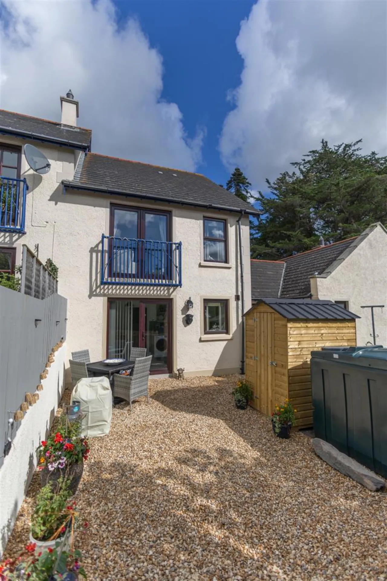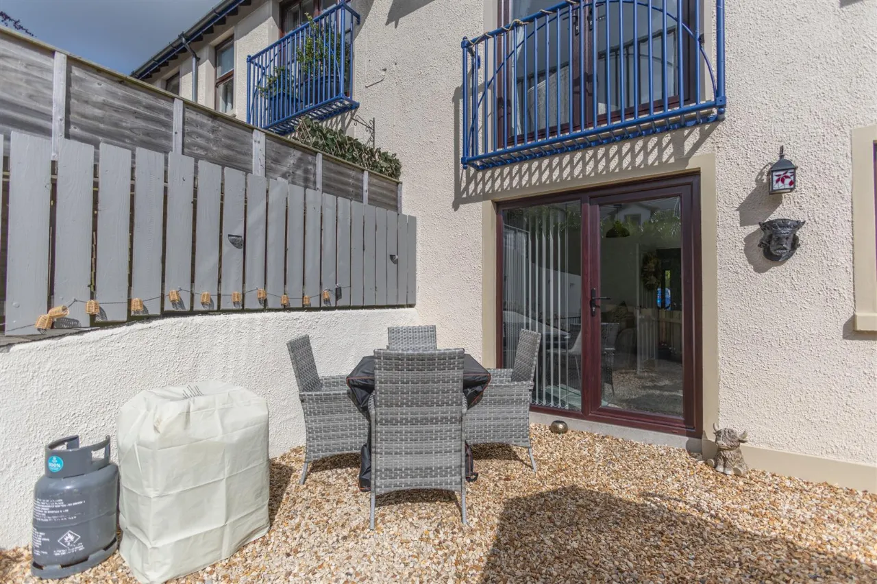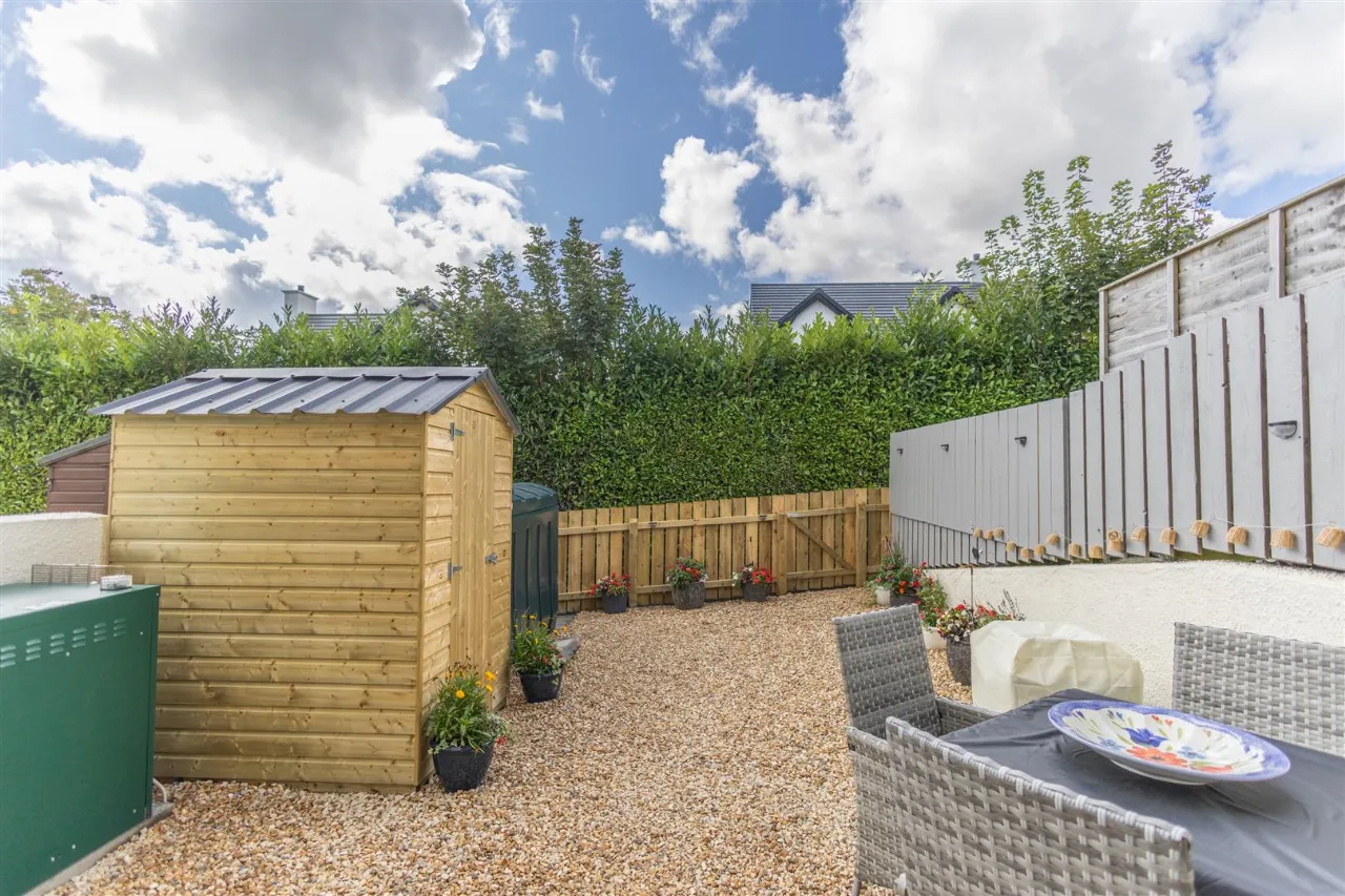 The property boasts a private, south-facing rear garden, fully enclosed with fencing and mature hedging for added seclusion. Designed for low maintenance, the garden is neatly stoned and complemented by attractive shrub borders.
