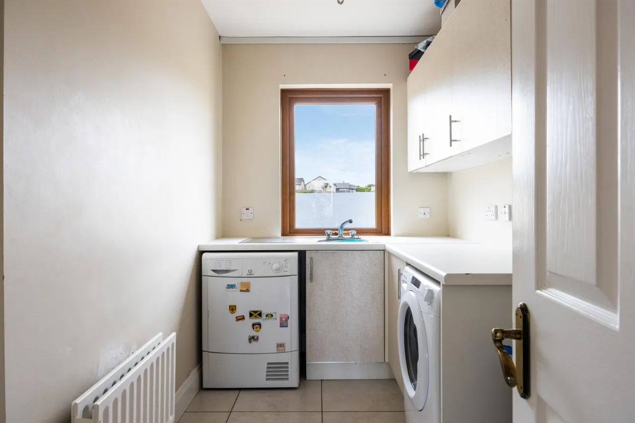 The utility room is fitted with a range of high and low-level units, an inset stainless steel sink, and is plumbed for a washing machine, offering practical and functional space for everyday household tasks.