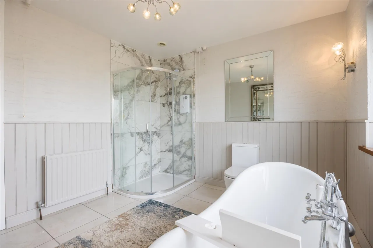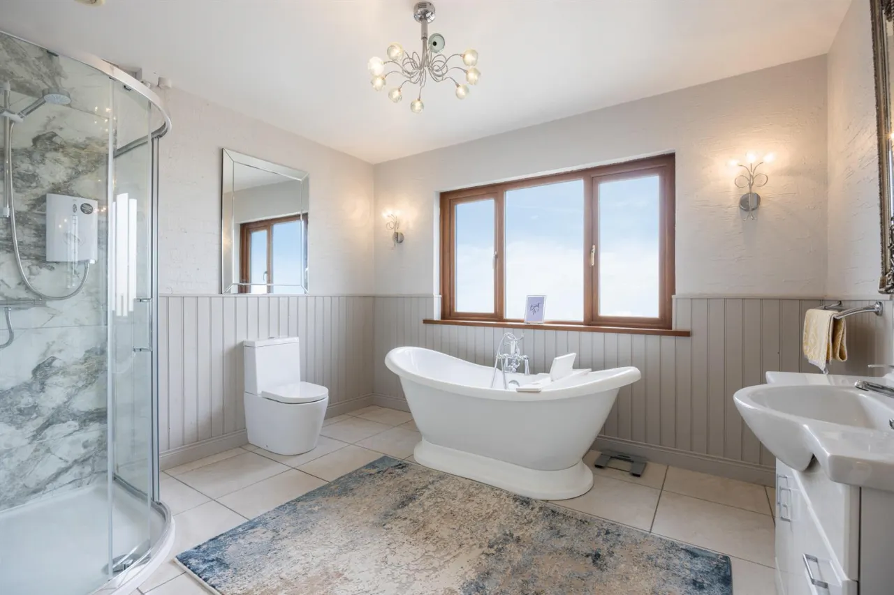 The bathroom is beautifully finished and features a freestanding bath, a separate shower enclosure, low flush WC, and a modern vanity unit with wash hand basin.