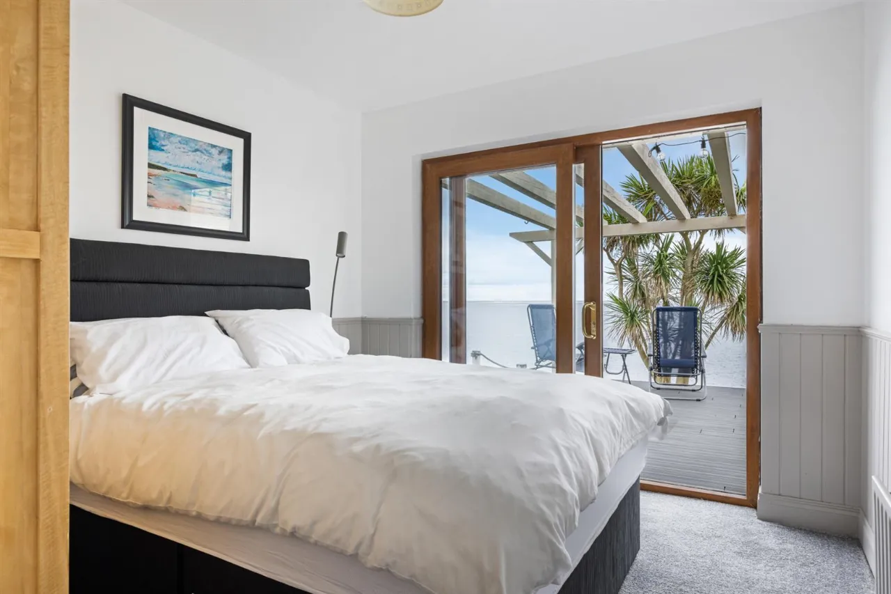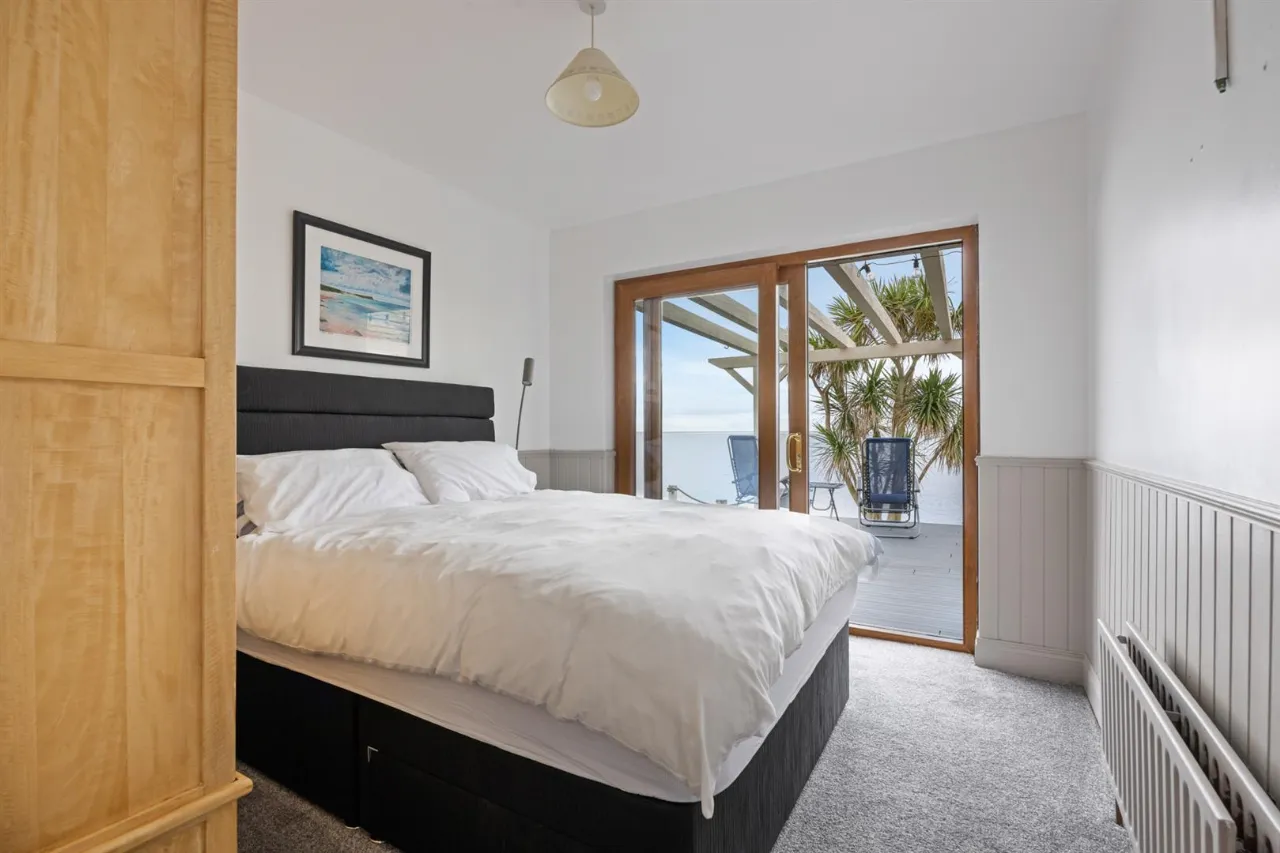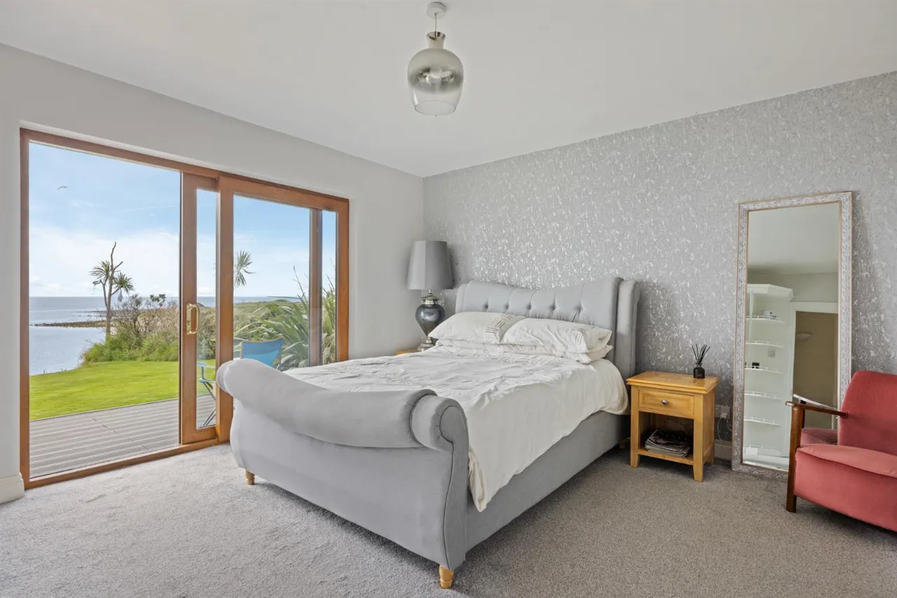 Bedroom One is a spacious and light-filled room featuring carpet flooring, a luxury ensuite shower room, and sliding doors leading out to the raised decking area — perfectly positioned to enjoy the breathtaking sea views.
