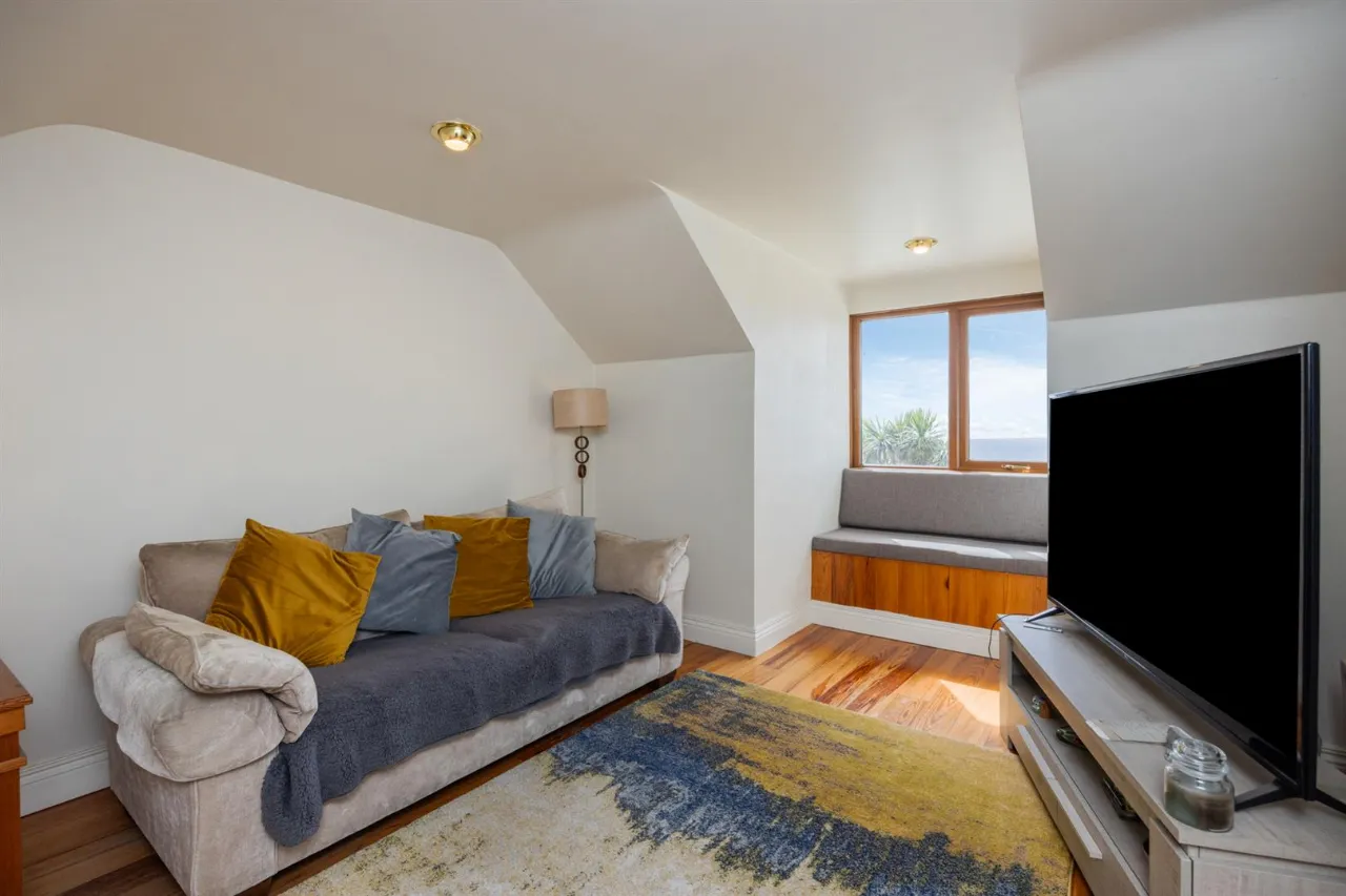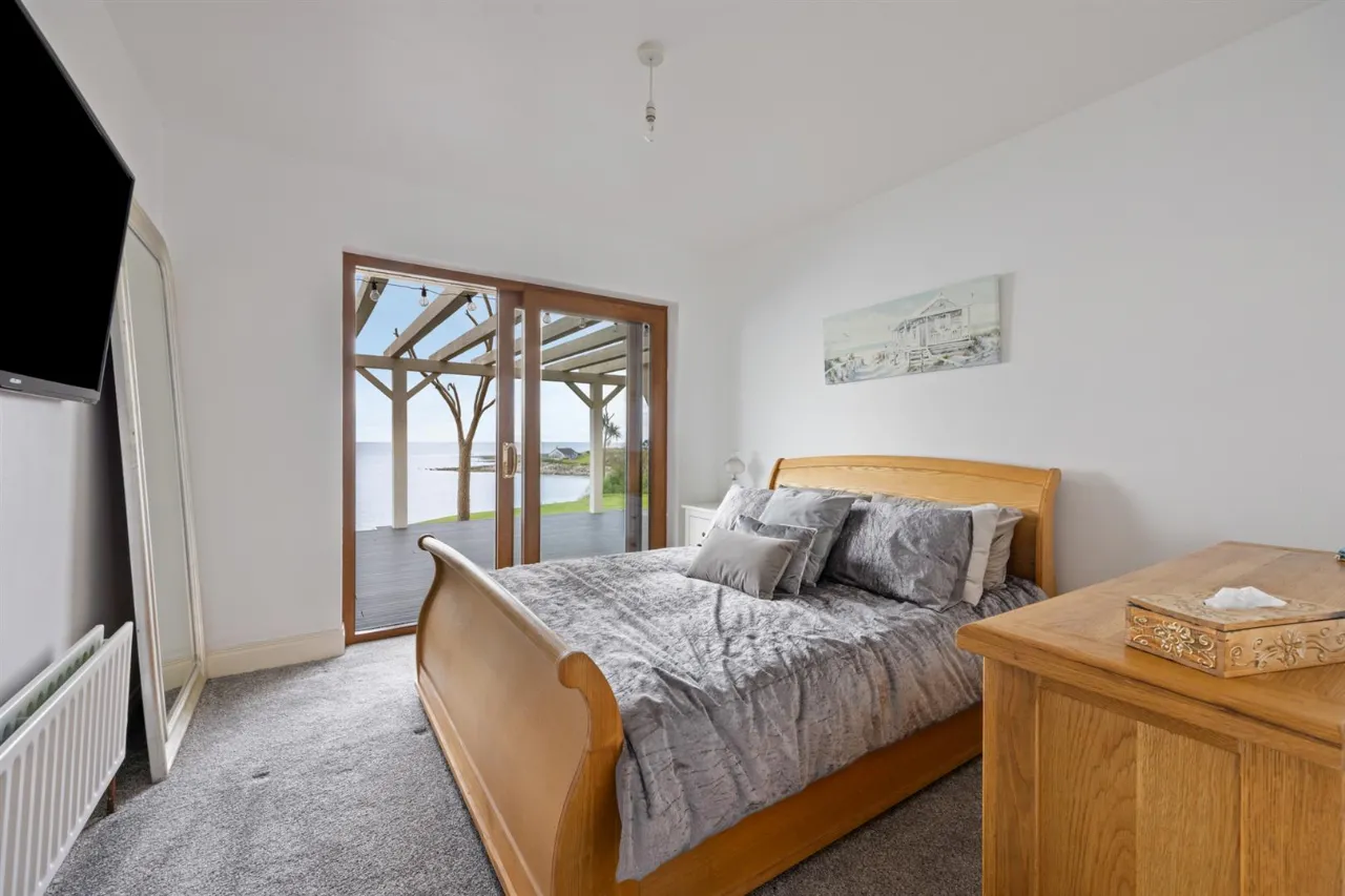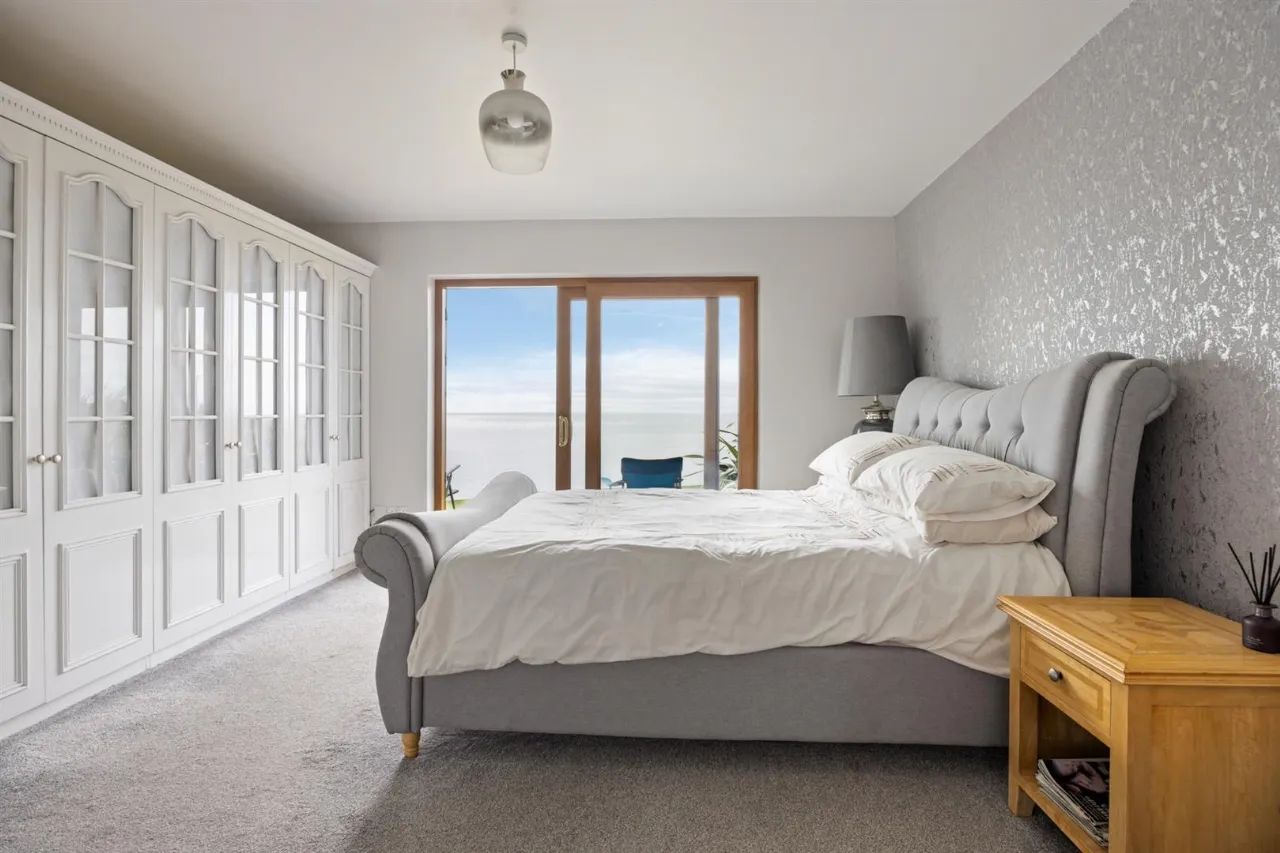 Bedroom One is a spacious and light-filled room featuring carpet flooring, a luxury ensuite shower room, and sliding doors leading out to the raised decking area — perfectly positioned to enjoy the breathtaking sea views.