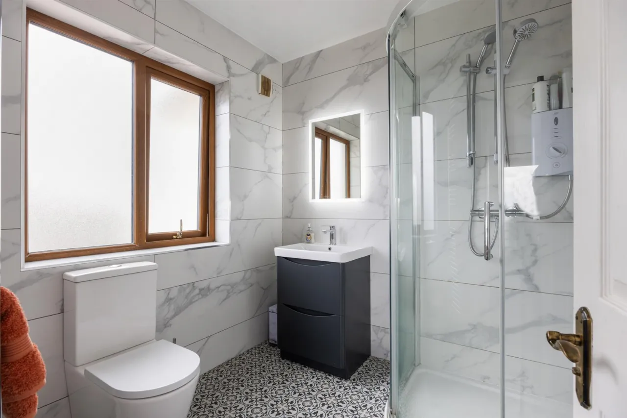 The master bedroom benefits from a stylish ensuite shower room, featuring a modern suite with fully tiled shower enclosure, vanity unit with wash hand basin, and low flush WC.