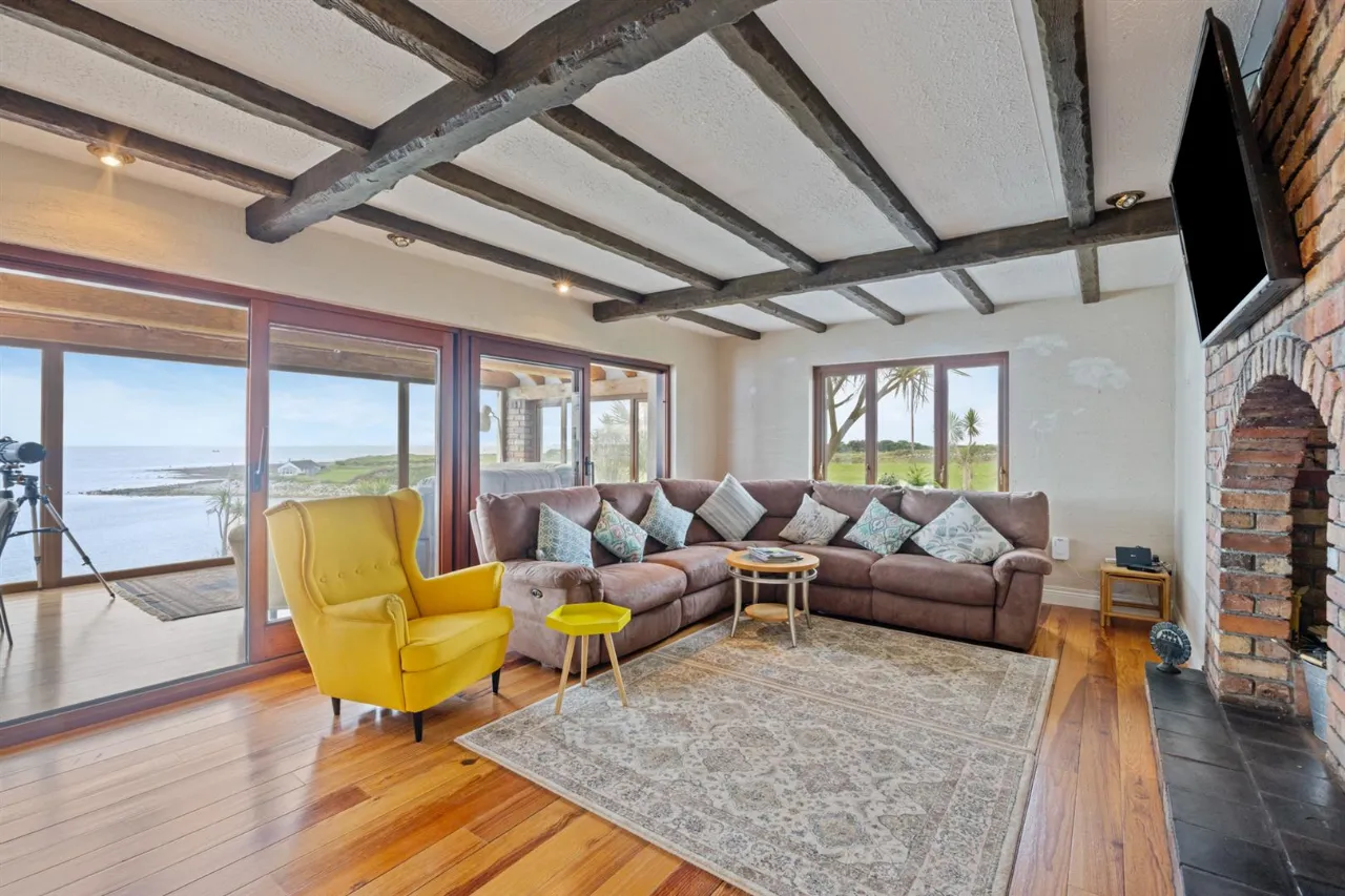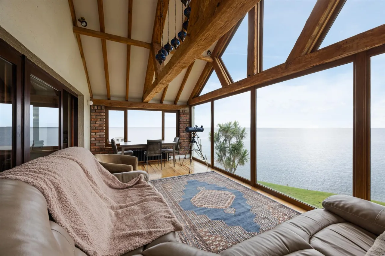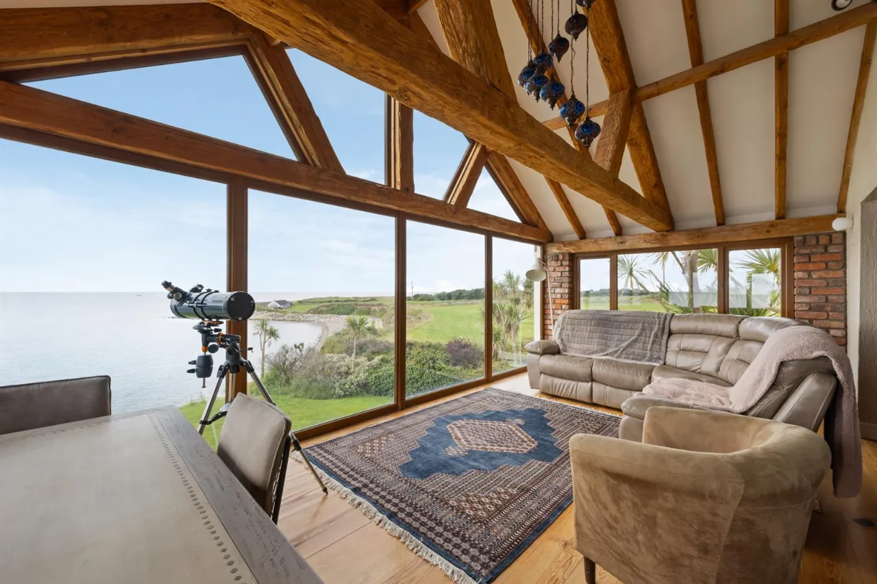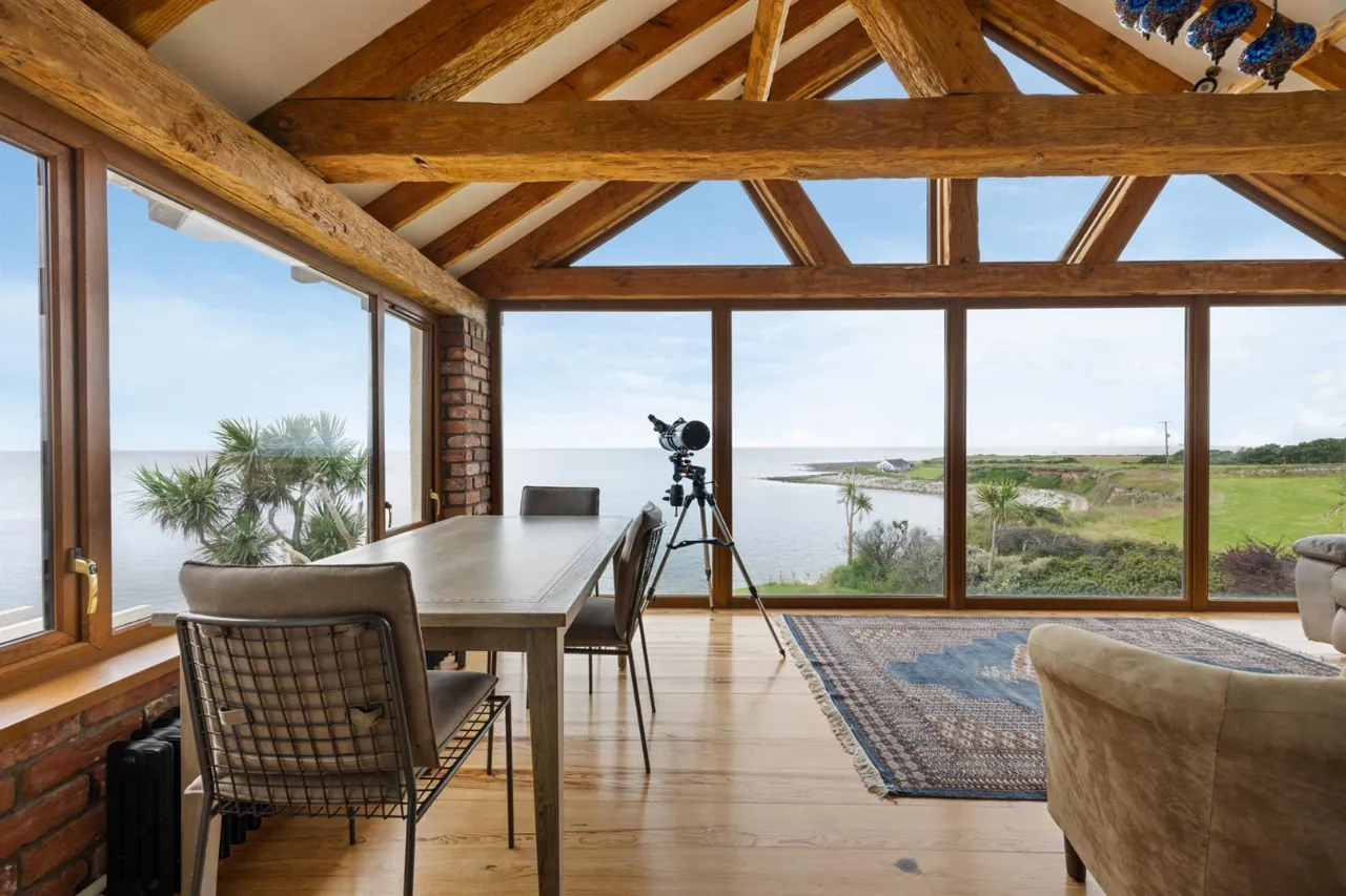The sunroom boasts stunning panoramic views and is finished with a wooden floor, creating a bright and relaxing space to enjoy the surrounding scenery year-round.