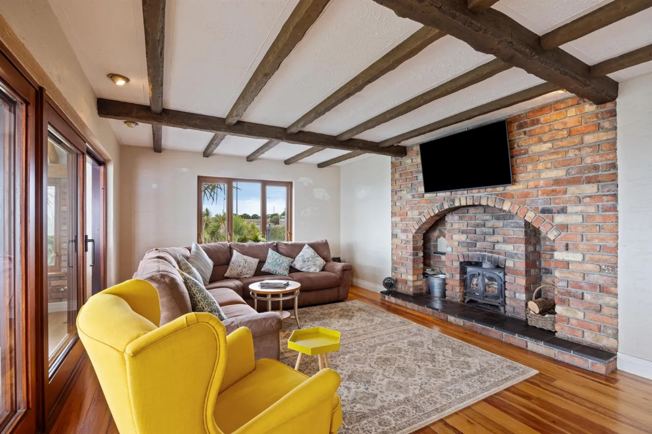 The living room features a charming brick fireplace with a wood-burning stove, creating a warm and inviting focal point, complemented by a stylish wooden floor.