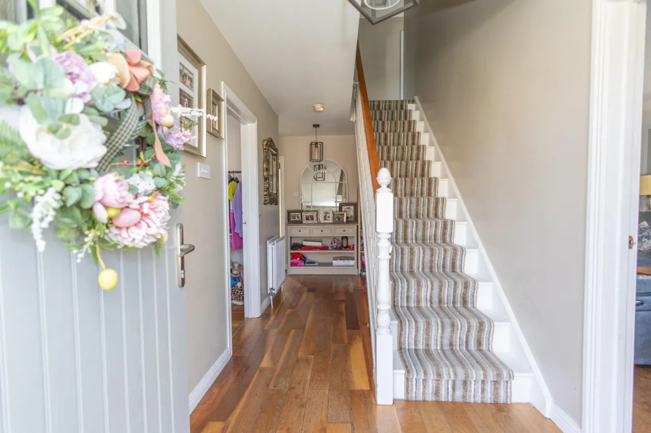 Wooden Floor, Composite front door, Radiator, Wooden stair case with carpet runner.