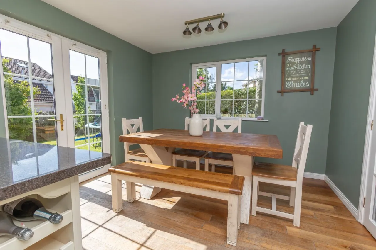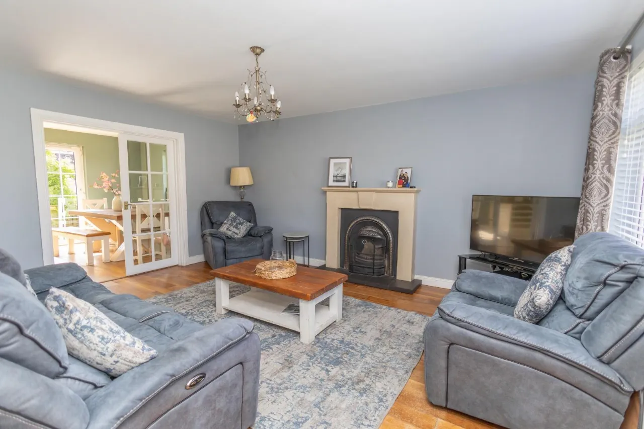 Decorative transition from tiles to wooden floor, Double patio doors leading to rear garden, Radiator.