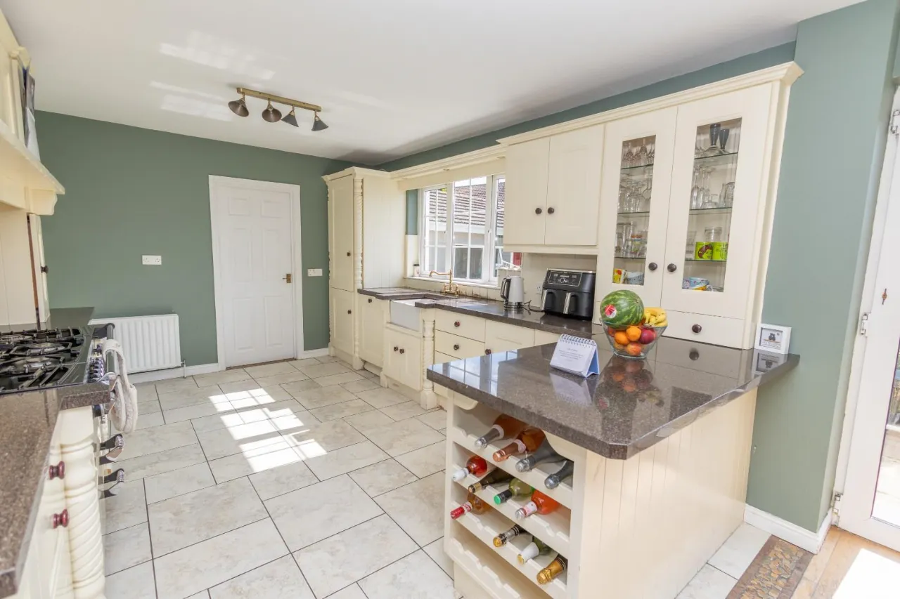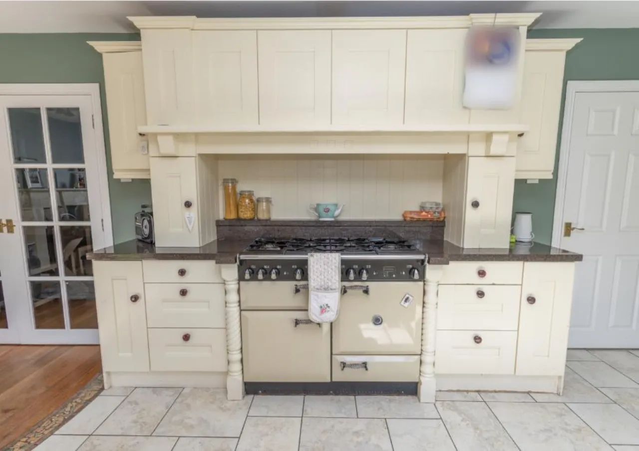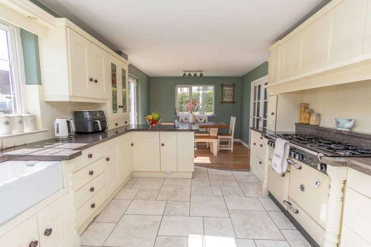 Tiled floor, Rangemaster aga, High and low level storage units, Fire clay Belfast sink, Marble worktop, Extractor fan, Integrated Fridge Freezer.