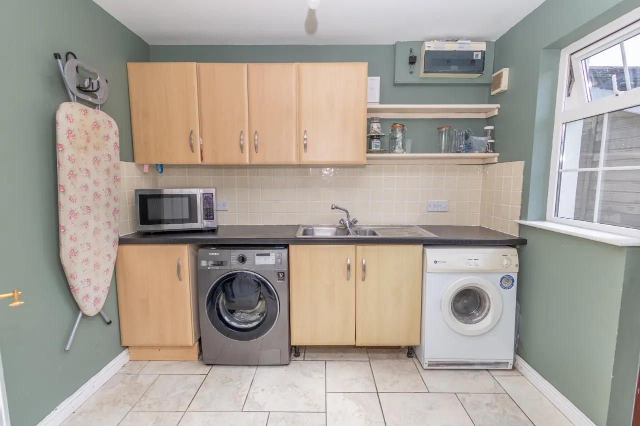Tiled floor, High and low level storage units, Double basin sink, Samsung tumble dryer, White Knight washer machine.