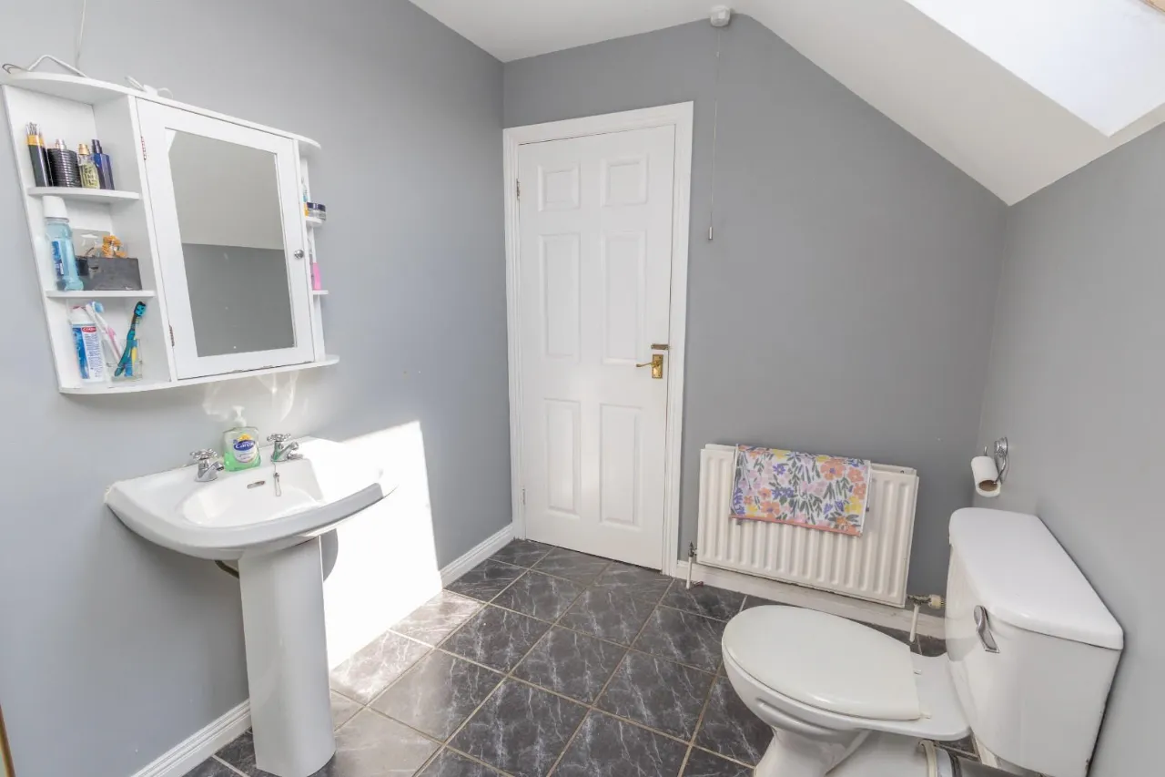 Tiled floor, Shower with tiled surround, Toilet, Sink
