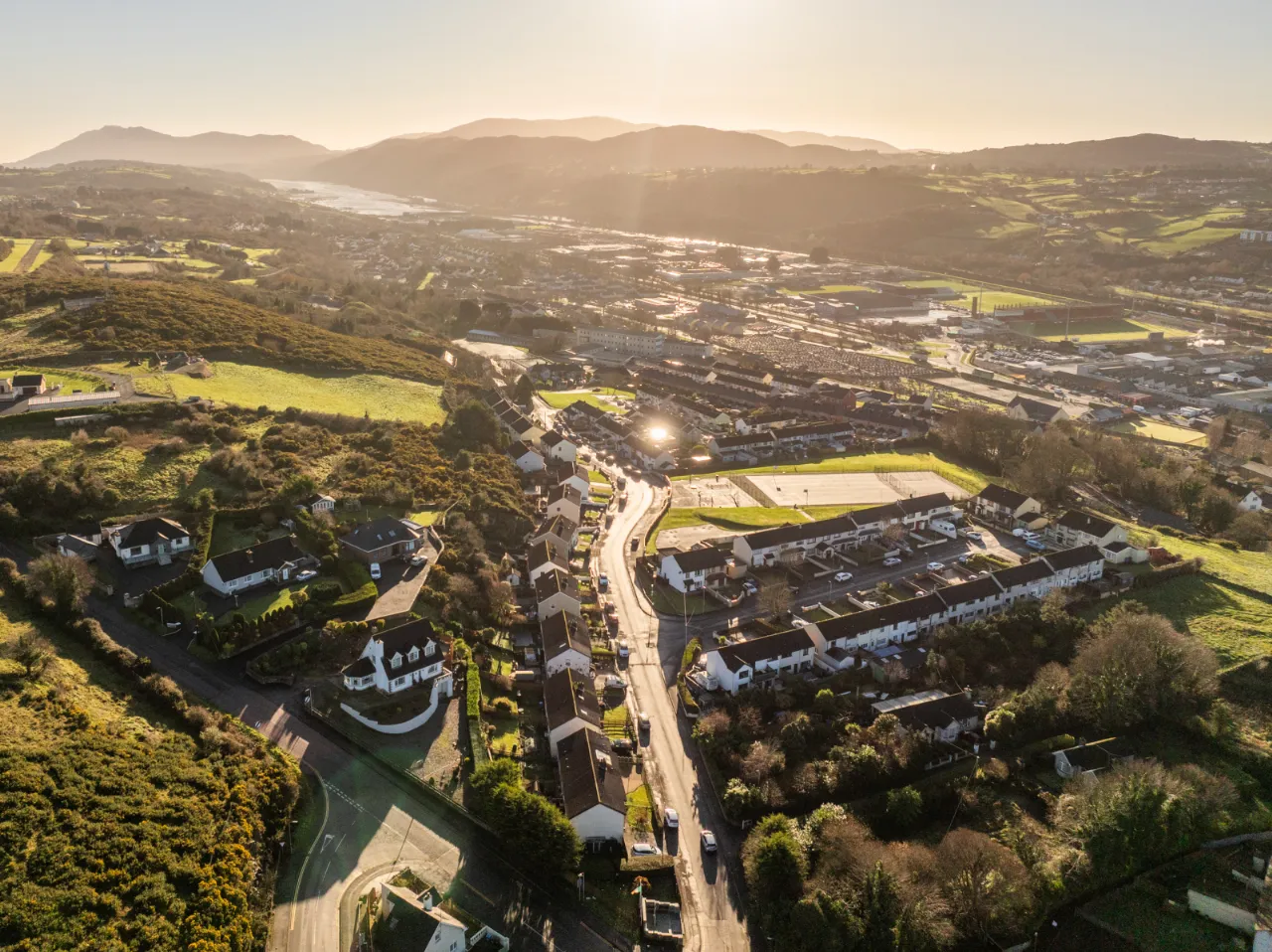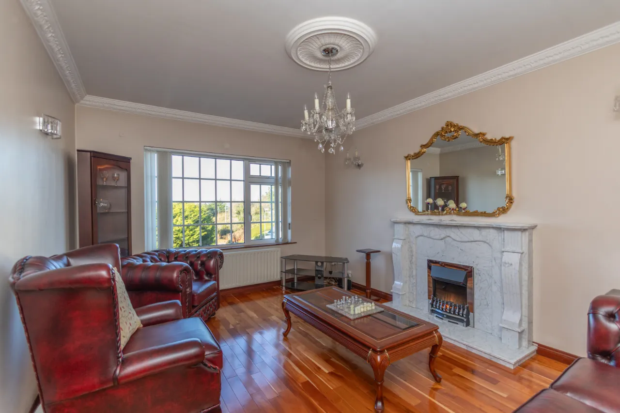 Varnished wood floor, marble fireplace and hearth with electric fire insert, chandelier, wall lights.