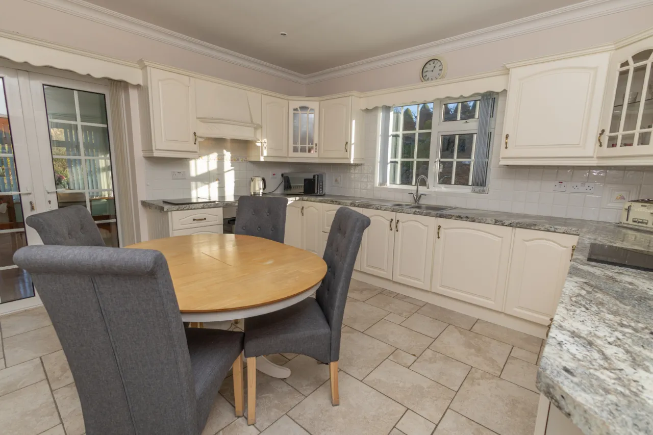 Tiled floor, high and low level storage units, tiled splachback surround, double doors leading to sun room, electric hob and cooker, double basin sink.
