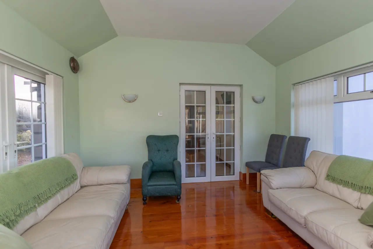 Varnished wooden floor, low level radiators, double patio doors, vertical blinds.