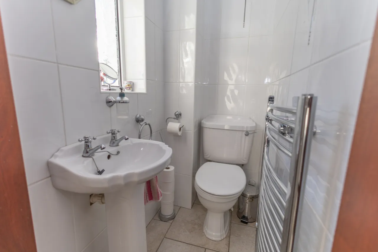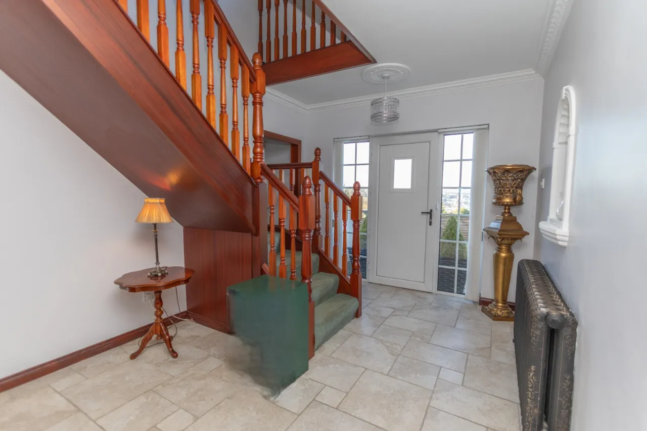 Tiled floor, cast iron radiator, L shaped carpet staircase leading to first floor.