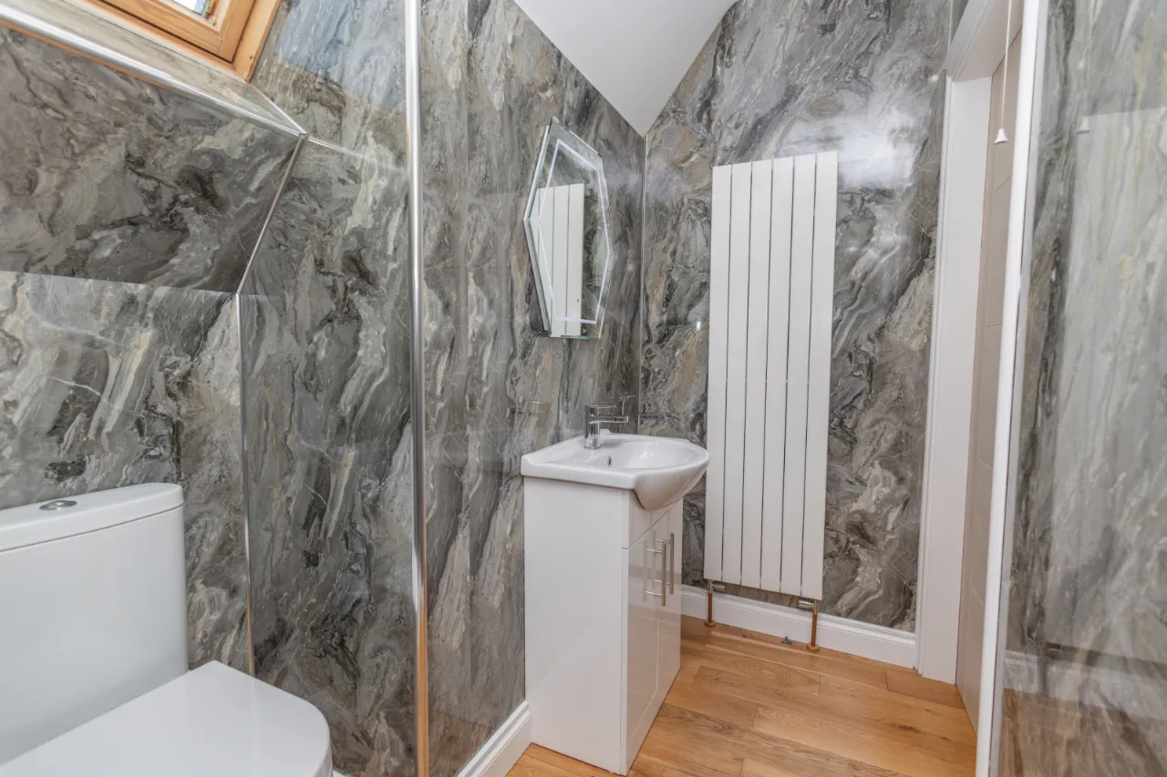 PVC marble effect surround, LED illuminated mirror, toilet, sink, skylight window.