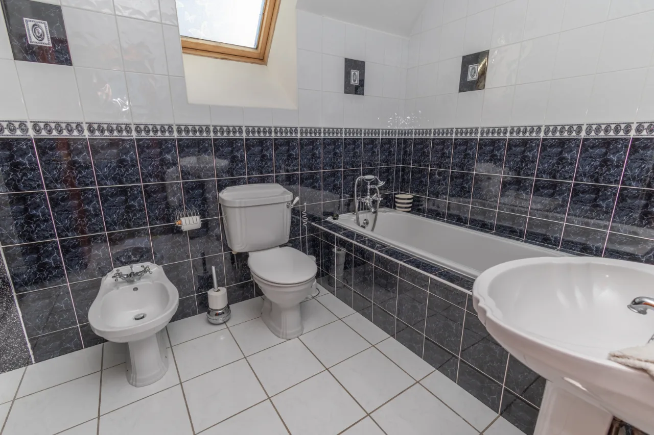 Tiled surround, toilet, sink, seperate bath and shower, bidet toilet, skylight window, LED illuminated mirror.
